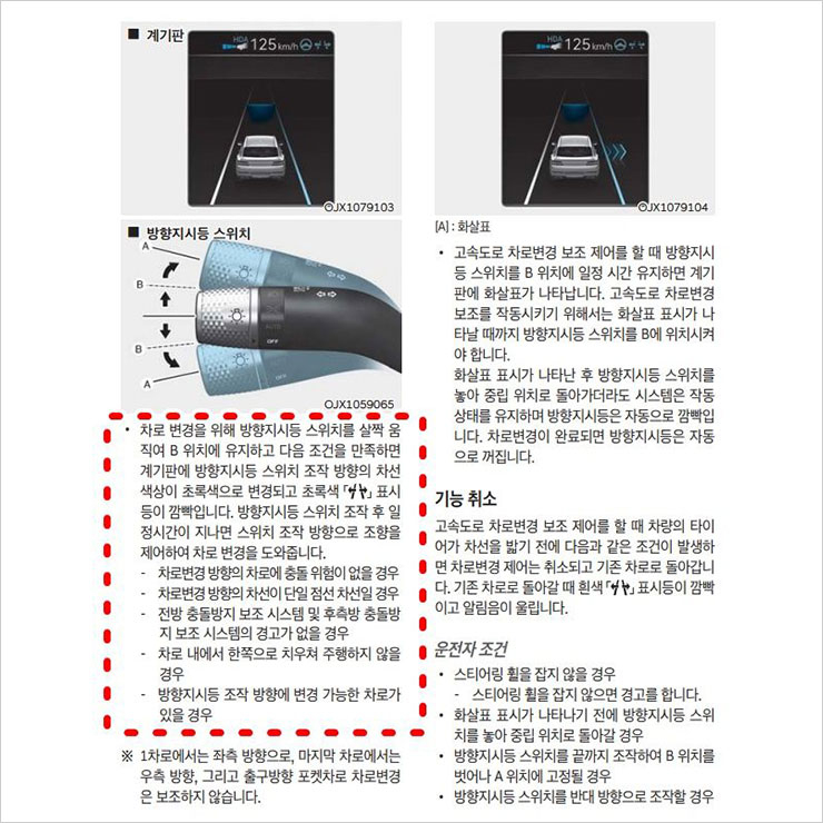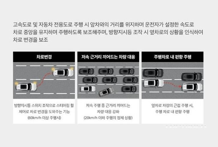 자율주행 2.5단계의 GV80은 앞서 언급한 것과 같이 많은 신기술을 보유하고 적용했다. 하지만 아직까진 조금 더 지켜볼 필요가 있겠다. 물론 점차 수정해 나가겠지만, 방향지시등만 켜면 차가 알아서 차선을 바꾸는 기능은 아직 온전히 녹아들진 못했다. 작동에 앞서 발동 조건을 잘 알아보고 사용해야 한다. 제네시스가 언급한 차선 변경 보조 기능 실행 조건은 다음과 같다.