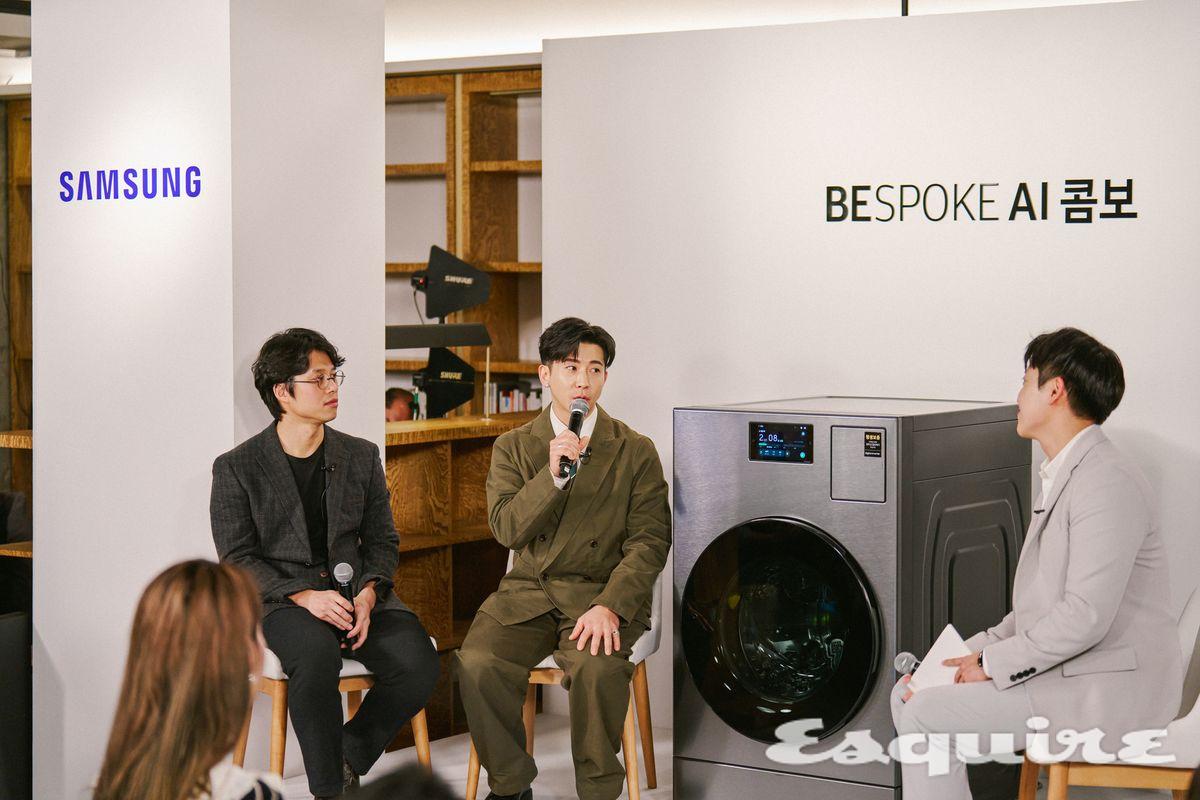 삼성전자와 브라이언의 만남도 ‘시너지’의 좋은 예다. 지난 3월 7일 저녁, 에스콰이어 사무실 지하에서는 ‘클럽 에스콰이어’의 일환으로 인플루언서들을 초빙해 세탁 기술의 발전에 대해 이야기하는 미니 토크쇼가 열렸는데, 이때 삼성전자와 브라이언이 함께 비스포크 AI 콤보의 기능과 가능성에 대해 짚었던 것이다. 브라이언은 이름난 살림 전문가답게 이미 비스포크 AI 콤보의 속성을 속속들이 파악한 상태였고, 해당 제품의 기획을 도맡았던 삼성전자 DA 사업부 염철민 프로는 연신 감탄하며 그에 대한 상세한 기술적 설명과 수치를 덧붙였다. 예를 들어 브라이언이 ‘기존 세탁기와 건조기의 경우 일단 세탁을 시작하면 끝날 때까지 자리를 뜰 수가 없어 약속까지 취소한 적이 있었다’는 일화를 들려주면 염철민 프로가 ‘비스포크 AI 콤보는 세탁물의 무게, 오염도, 종류를 파악해 적정량의 세제를 투입하고 맞춤으로 세탁한다. 건조 역시 최적화하며 모두 끝난 후에는 자동으로 도어를 개방해 환기하거나 구겨지지 않게 주기적으로 뒤집도록 설정할 수 있다’고 설명하는 식이었다. 여기서 중요한 건, 자동으로 인식하고 제안하는 기능이 단순히 편의성만을 뜻하지 않는다는 것이다. 적정량의 세제, 적합한 세탁 방식, 최적화된 건조는 옷감의 손상을 최소화하고 나아가 환경을 지키는 데에도 도움을 준다. 염철민 프로는 효율적인 세탁 알고리즘을 통해 에너지소비효율 1등급 기준보다 40%나 에너지를 적게 쓰면서도 대용량 히트펌프의 최적 설계를 통해 효율적인 건조 성능까지 확보했다며, 비스포크 AI 콤보가 라이프스타일의 혁신적 변화를 도모하면서도 부수적 비용을 동반하지 않는다는 점을 강조했다.