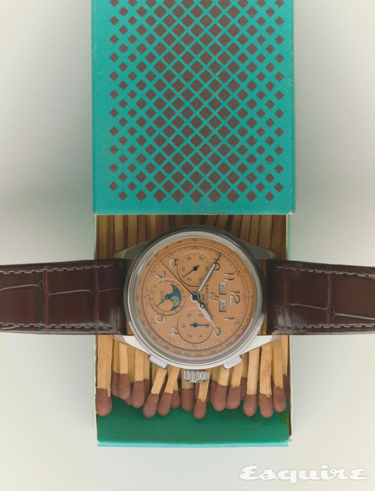 컴플리트 캘린더와 문페이즈, 크로노그래프를 통합한 시계. 불그스름한 코퍼 다이얼과 브라운 악어가죽 스트랩이 고급스러운 프리미에르 B25 다토라 42 1948만원 브라이틀링.