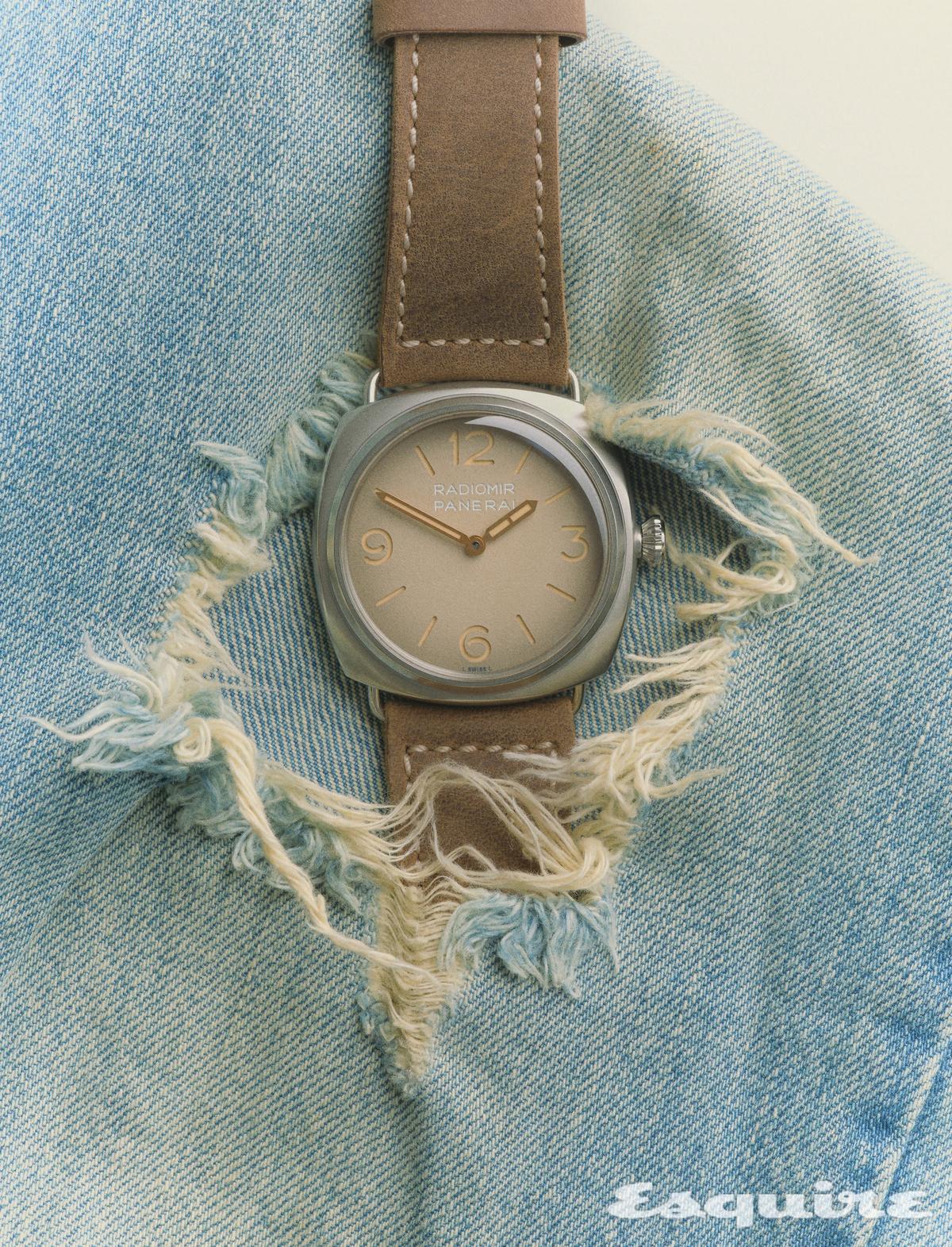 45mm 쿠션형 케이스와 주변부로 갈수록 어두워지는 베이지 그러데이션 다이얼의 조합. 3일의 넉넉한 파워 리저브를 자랑하는 라디오미르 트레 지오르니 900만원대 파네라이.