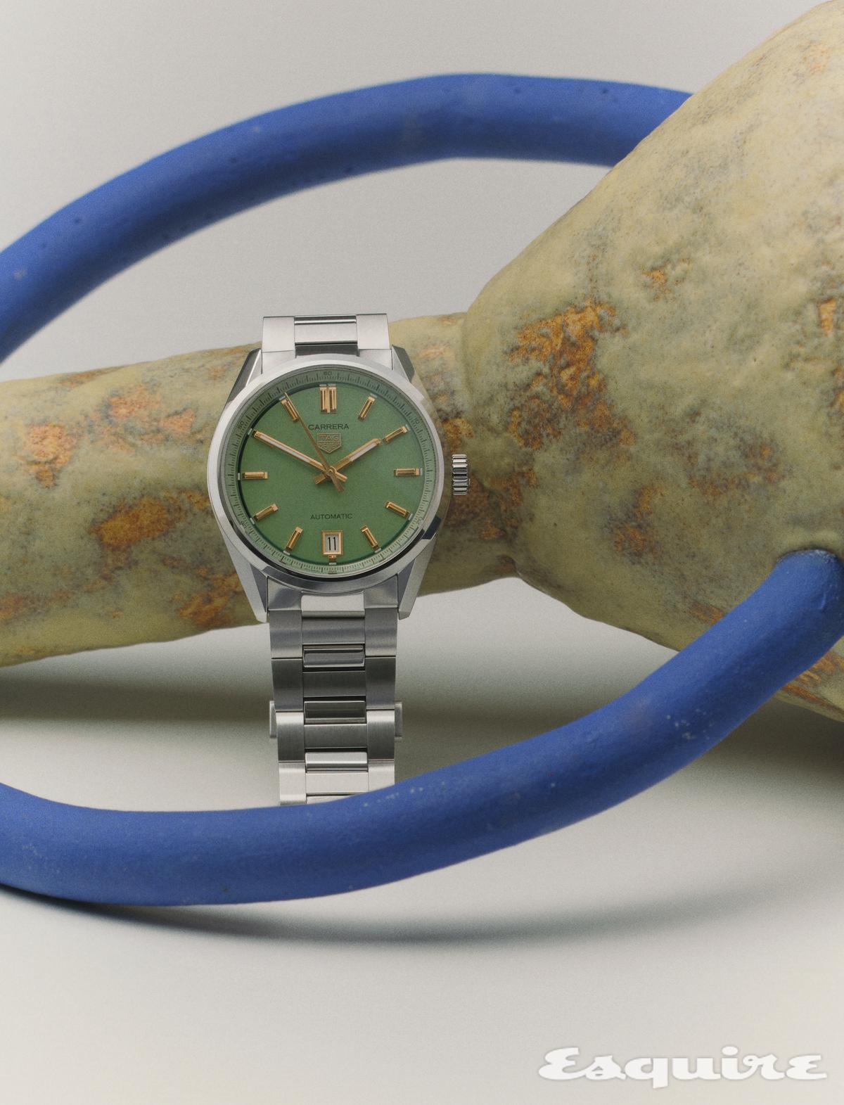 선레이 브러싱 처리한 파스텔 그린 다이얼과 로즈 골드 인덱스의 조화가 산뜻하다. 오토매틱 칼리버 7을 탑재한 까레라 데이트 36mm 465만원 태그호이어.