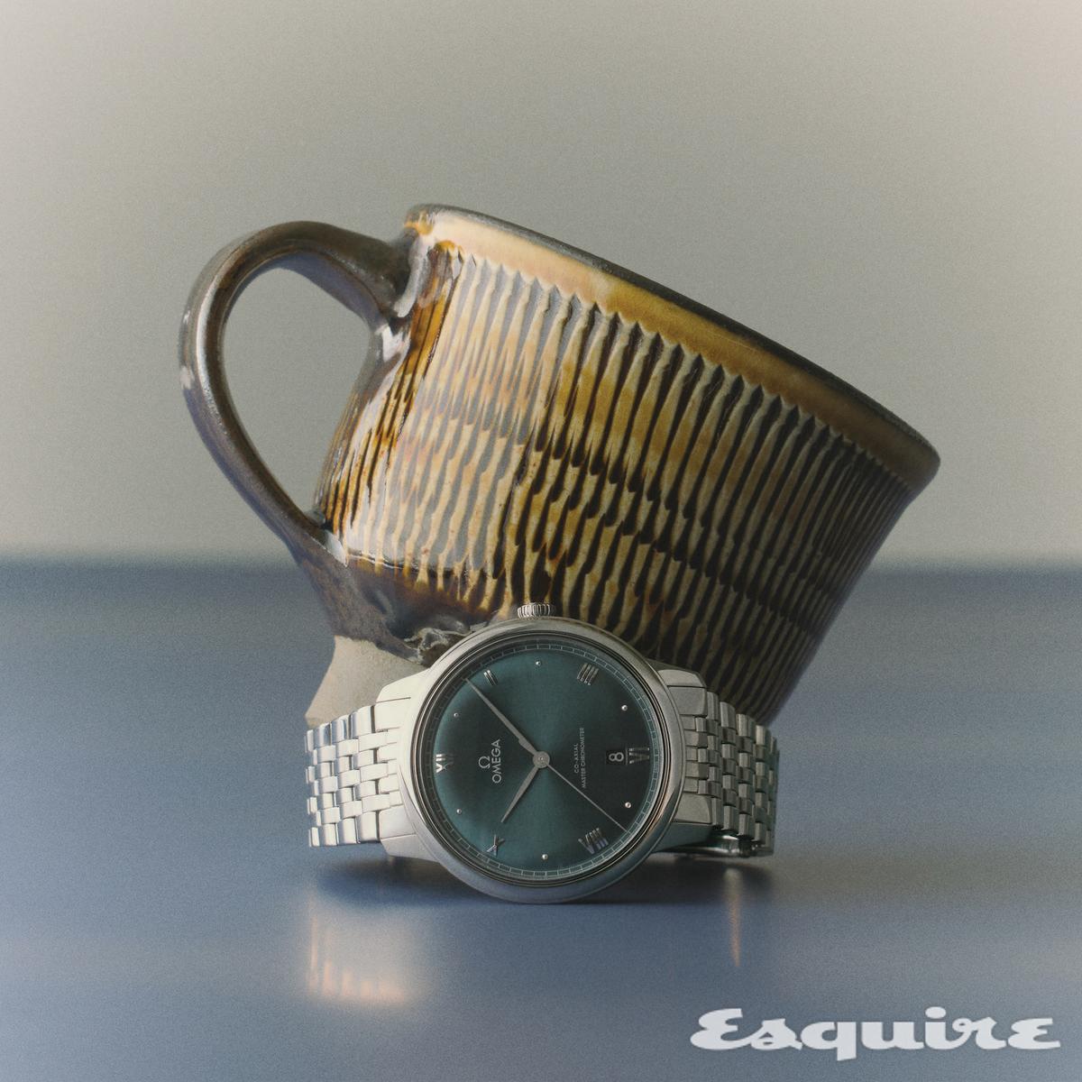 블루와 그린 경계에 있는 오묘한 다이얼 컬러가 시선을 사로잡는다. 40mm 스틸 케이스와 브레이슬릿을 매치한 드 빌 프레스티지 700만원대 오메가.