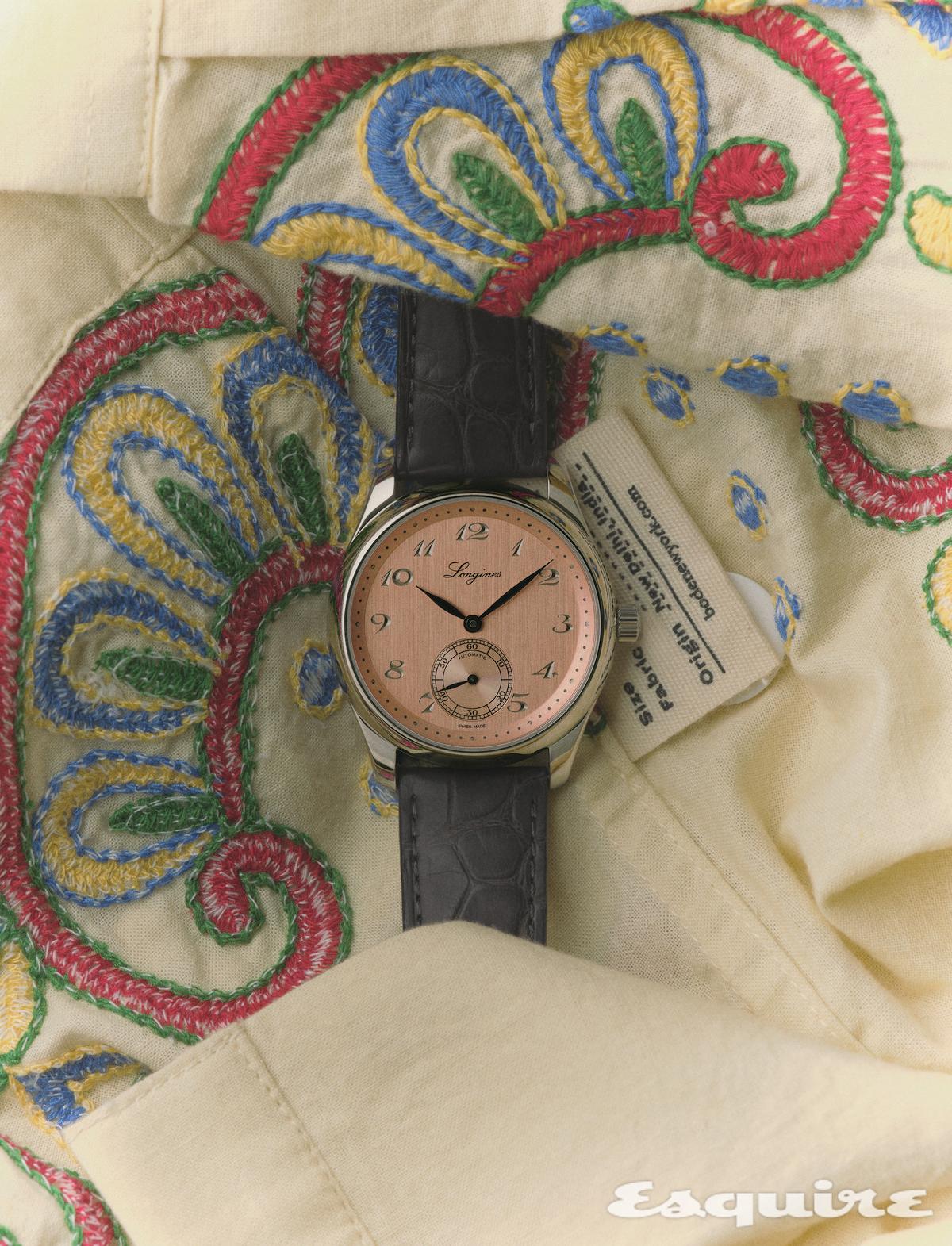 아라비아숫자를 인그레이빙한 연분홍 다이얼과 6시 방향의 스몰 세컨드가 특징. 매끈한 38.5mm 스틸 케이스의 마스터 컬렉션 340만원 론진.