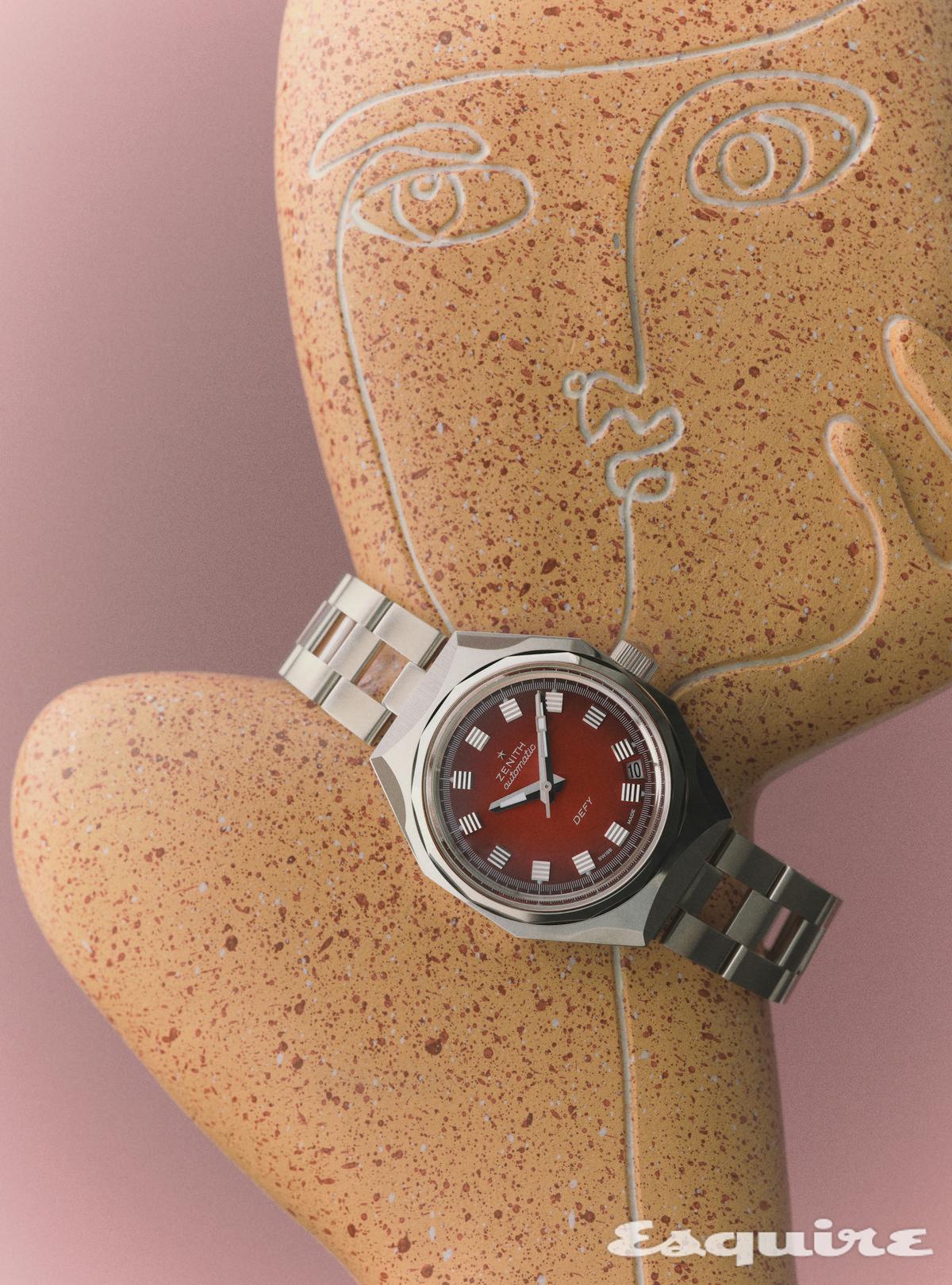 딥 레드 다이얼에 가장자리로 갈수록 점점 어두워지는 비네트 효과를 더했다. 매뉴팩처 오토매틱 무브먼트 엘리트 670을 탑재한 데피 리바이벌 A3691 1076만원 제니스.