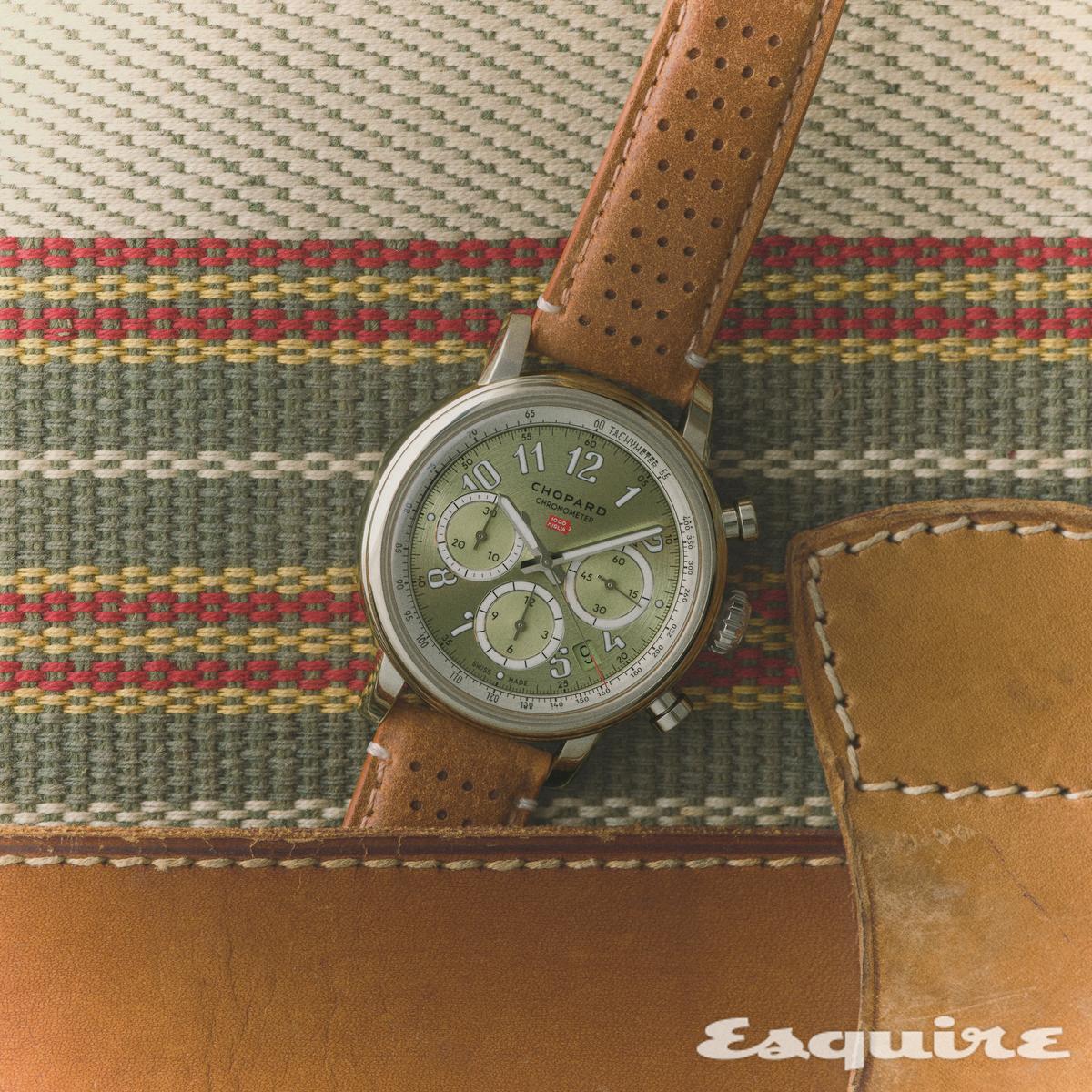 피스타치오 컬러의 라이트 그린 다이얼을 정교하게 새틴 브러시 처리했다. 40.5mm 루센트 스틸 케이스의 밀레 밀리아 클래식 크로노그래프 1673만원 쇼파드.