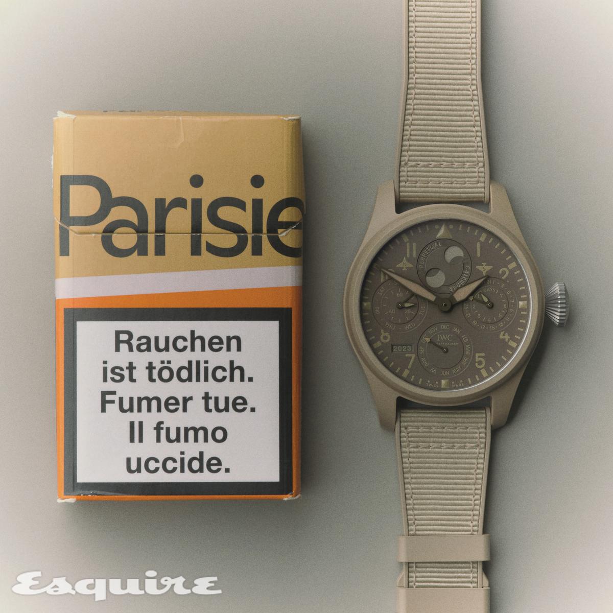 모하비사막의 풍경에서 영감을 얻은 샌드 컬러 세라믹 케이스와 러버 스트랩, 절제된 다크 브라운 다이얼이 인상적이다. 빅 파일럿 워치 퍼페추얼 캘린더 탑건 모하비 데저트 에디션 5370만원 IWC.