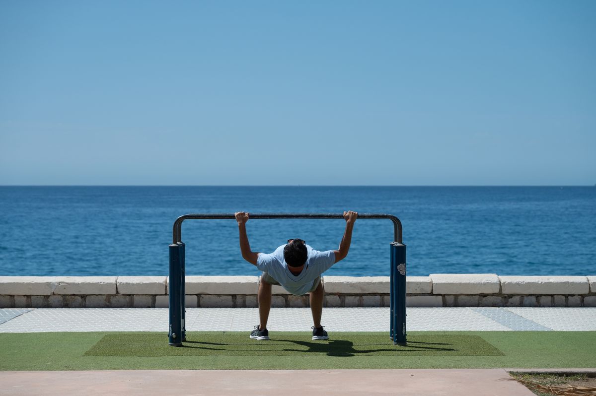 푸시업은 언제 어디서나 편하게 할 수 있는 운동이죠. 상체 근육을 골고루 사용하고요. 손은 어깨 넓이로 벌리고 팔꿈치는 너무 벌어지지 않게 신경 써주세요. 가슴이 땅에 닿을만큼 깊이 수행하면 좋아요!
