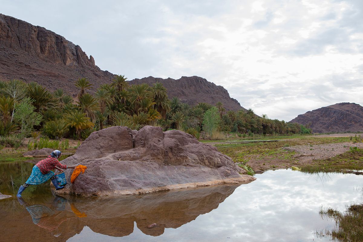 핀트의 여성이 근처 강에서 빨래를 하고 있다. 수천 년 동안 오아시스는 인간의 재주와 지속 가능한 발전의 살아 있는 심벌이었다. 오아시스 주민들은 제한된 자원을 최대한 활용해 전적으로 인공적인 환경에서, 또한 세상에서 가장 적대적인 기후 속에서 번창할 수 있었다. “오아시스는 고립된 생태계였습니다. 사람들은 필요한 모든 것을 직접 생산해야 했고, 수천 년 동안의 실험을 통해 얻은 노하우로 그렇게 해왔죠.” 스쿠라의 농학자 압델카림 부아리프의 설명이다.
