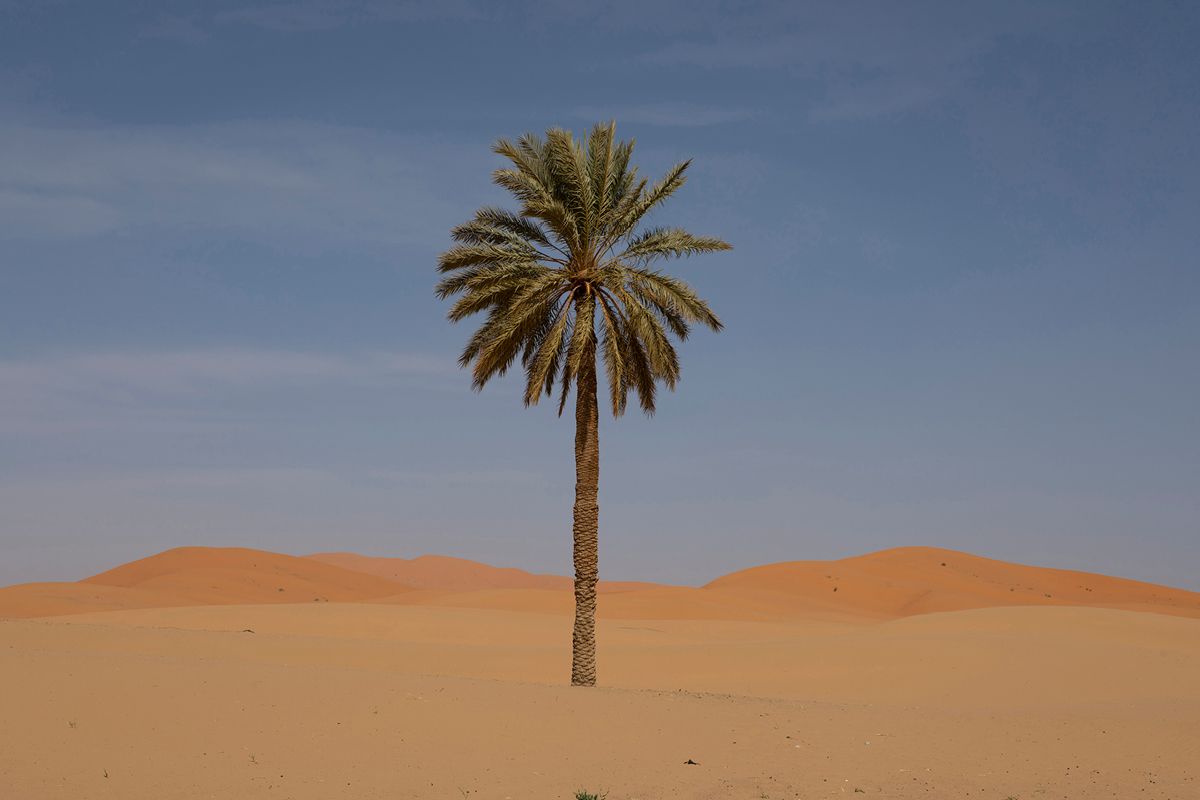 메르조가 사구들 틈에 야자나무 한 그루가 서 있다. 오아시스는 야자나무를 중심으로 하는 독특한 농업 시스템에 기반하고 있다. 야자나무는 대추야자(오아시스의 주요 농작물)를 제공하고, 강렬한 태양빛으로부터의 그림자를 만들어주며, 그 아래에서 과수원, 채소, 사료 작물을 키울 수 있도록 수분도 유지해준다. 이와 같은 다양성이 오아시스를 지극히 회복력 있고 날씨 변화에 적응할 수 있는 곳으로 만들어주곤 했다. “석류, 사과, 살구, 복숭아, 올리브, 밀, 보리…. 건강한 오아시스에선 무엇이든 자랄 수 있죠.” 스쿠라 사막의 오아시스 출신 농학자 압델카림 부아리프의 설명이다. “생물다양성에 바치는 찬가와도 같은 존재예요. 모든 식물이 시너지 속에 살아가며, 야자나무는 그중 오케스트라 리더라고 할 수 있죠.”