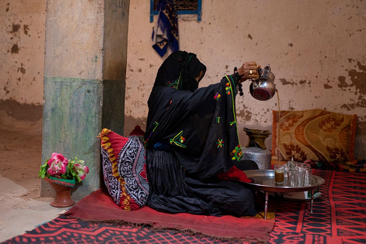 카스르 부누 출신 여성이 잔에 차를 따르고 있다. 오아시스는 모로코 국토 표면적의 15% 정도를 덮고 있으며, 약 200만 명이 거주한다. 대부분은 아틀라스 산맥 남쪽의 넓은 사막 분지에 위치한다. 사하라와 지중해 해안을 잇던 카라반 루트를 따라 분포해 있다. 주민들은 과거 수세기 동안 이 땅을 지배했던 유목 부족의 자랑스러운 후예들이며, 이 땅에 대한 본능적인 애착을 품고 있다.