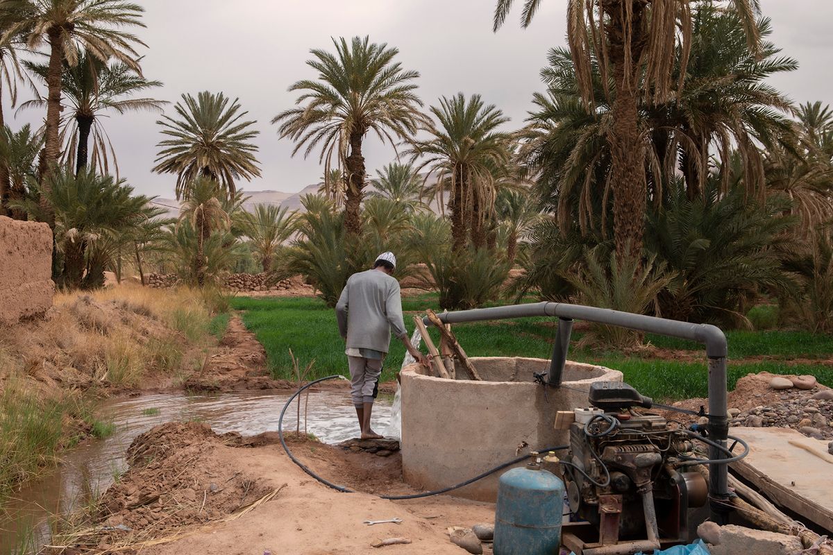 주이아 데 시디 엘목타르 벤 알리 마을의 한 농부가 자기 밭에 물을 대려고 우물물을 펌프질하고 있다. 예전에는 오아시스의 수자원을 철저히 통제했다. 농부들은 경작지의 넓이에 따라 정해진 양의 물을 개간 시기를 돌아가며 배정받았다. 그러나 펌프가 도입된 지금은 일부 가족들이 자기 구획에 물을 대기 위해 개인 우물을 팠고, 지하수가 고갈되면서 모든 오아시스의 사회적 기둥 중 하나인 공동 물 사용 원칙이 파괴되고 있다.