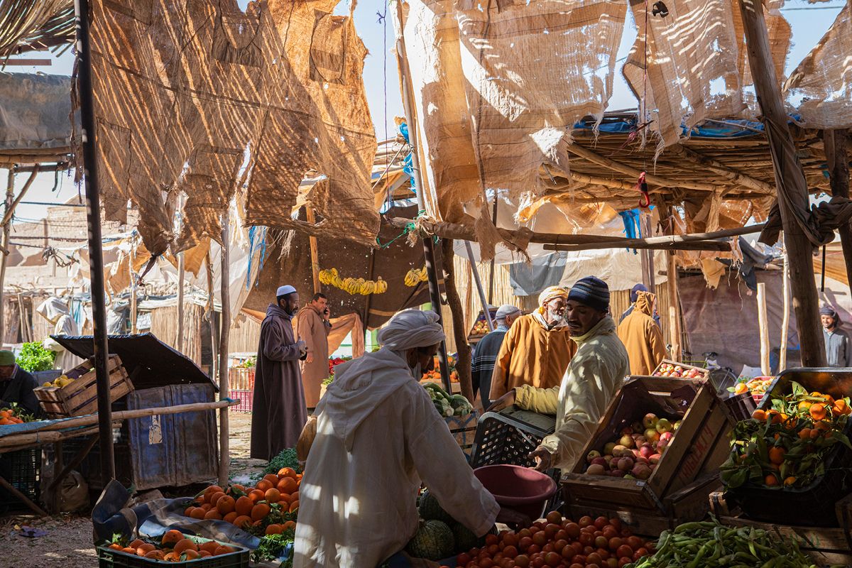 지즈 계곡 리사니 오아시스의 수크(시장)에서 판매 중인 과일과 채소. “10년 전만 해도 오아시스마다 작물과 푸른 식물이 잔뜩 있었어요. 이 지역 주민의 80%는 대추야자 거래에 의존하는 소규모 농부들인데, 이제 여긴 대추야자의 무덤에 불과하죠. 가슴 아픈 일입니다.” 자고라 출신 환경 활동가 자말 악크밥이 통렬히 말한다. 가뭄 때문에 일어난 들불로 최근 몇 년간 여러 지역에서 수만 그루의 야자나무가 불탔다. 가뭄이 잦아지자 수없이 많은 가족은 과수원, 밭, 야자나무를 하나씩 버릴 수밖에 없게 되었다.