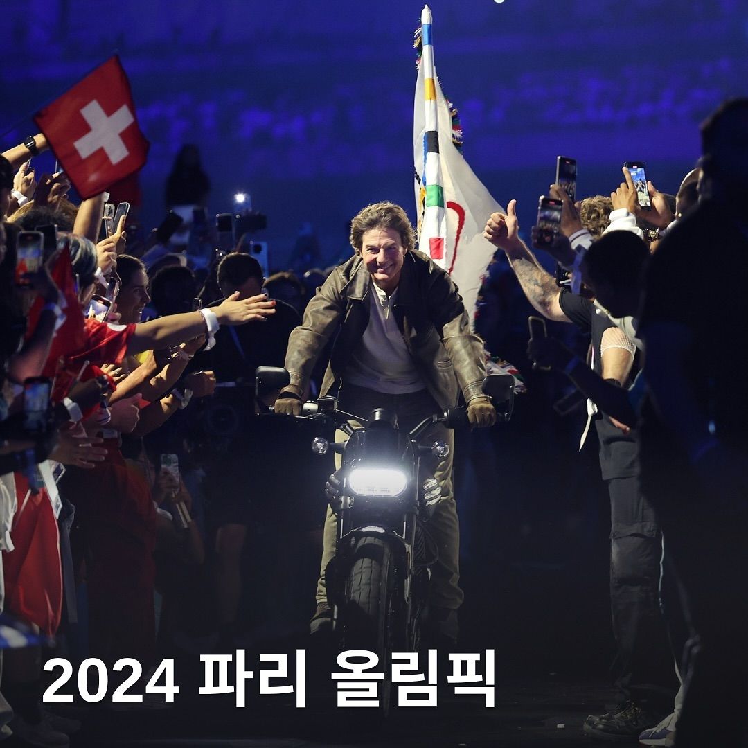 배우 톰 크루즈가 와이어 액션으로 공중에서 낙하를 펼치며 멋진 스턴트 쇼를 선보였죠. 영화 한 장면처럼 오토바이를 탄 후 LA 올림픽을 예고했어요.