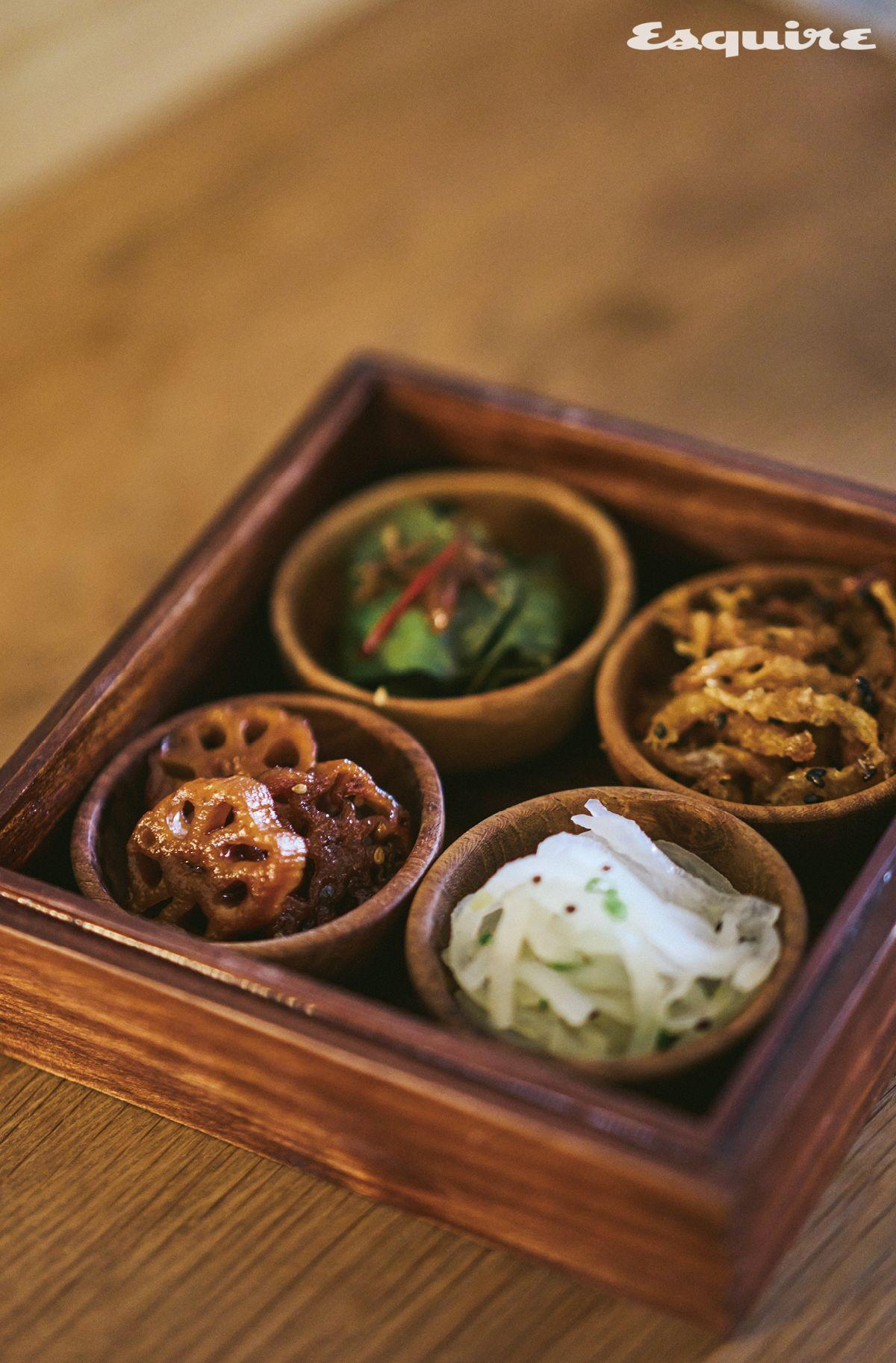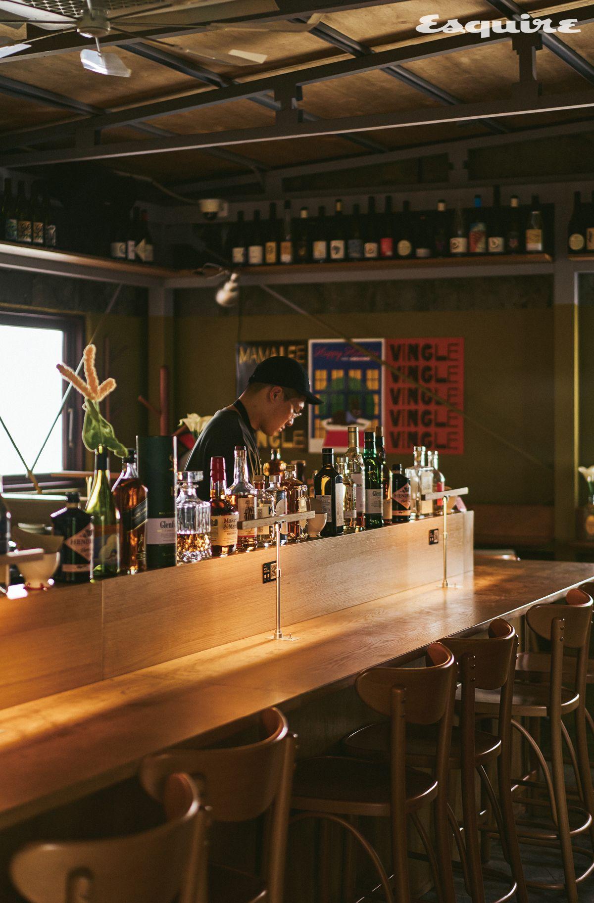 마마리는 인구밀도 대비 미쉐린 스타를 가장 많이 가진 도시 스페인 산세바스티안의 파인다이닝에서 두루 수학한 송하슬람 셰프가 국내에서 전개 중인 브랜드다. 제철 식재료를 중심에 둔 ‘반찬’을 핵심으로 하는데, 그건 새로운 공간인 마마리와 뱅글도 마찬가지다. 아니, 오히려 집대성된 공간이라고 볼 수도 있다. 마마리와 뱅글은 1층 델리 공간 ‘마마리 마켓’에서 다양한 반찬, 빵, 식료품을, 2층의 ‘반찬 펍’ 공간에서 와인, 맥주, 하이볼 등 다양한 주류를 판매한다. 1층에서 마음에 드는 것을 이것저것 구매한 후 2층에서 술과 함께 즐길 수 있도록 한 것이다. 산세바스티안의 보편적 주점 형태인 타파스 바처럼. “술에 곁들일 간단한 음식을 말하는 타파스가 따지고 보면 반찬과 크게 다르지 않다고 생각했어요. 이 부근의 주요 연령층이 계속 낮아져서 이제는 성수, 연무장길이나 건대에서 오는 20대 유입률이 높기 때문에 와인을 좀 더 편하게 즐길 수 있는 공간으로 만들면 좋겠다는 생각도 있었고요.” 원래 마마리와 뱅글 자리에 있던 뱅글은 와인수입사 뱅브로와 밍글스 강민구 셰프가 협업해 만든 와인바였다. 그 공간을 이어받은 송하슬람 셰프는 곧 상호에서 ‘뱅글’을 뺄 계획이라고 귀띔하기도 했다. “그전의 고급스러운, 바꿔 말하면 가격 장벽이 높은 이미지를 지울 필요가 있다고 느끼고 있거든요.”