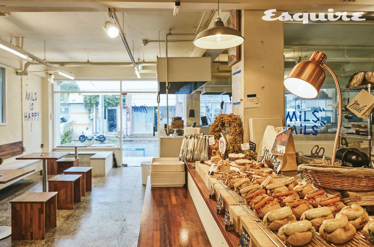 밀스는 덴마크 108, 한남동 모수 등 미쉐린 파인다이닝 레스토랑에서 이력을 쌓은 정영훈 셰프가 지난해 12월 오픈한 베이커리 카페다. 타르틴 베이커리 출신의 베이커, 세스크멘슬 출신의 샤퀴트리 전문가, 오츠커피 출신의 베버리지 디렉터까지 스태프들의 면면도 놀랍다. 이들이 밀스에서 각자의 전문 영역을 맞붙이고 섞으며 만드는 건 꽤나 창의적인 메뉴들이다. 다양한 종류의 소시지 번부터 포카치아를 곁들인 소시지 스튜, 베트남 샌드위치 반미를 변용한 반 밀스 번까지. 보거나 듣기만 해도 흥미롭지만 맛을 볼 때 가장 큰 감탄이 나온다. 그 맛을 위해 밀스가 얼마나 기본에 충실하고 수고로운 방식으로 일하고 있는지에 대해서도 할 말이 많다. 하지만 성수동이 과연 그런 디테일 차이를 받아들일 준비가 된 동네일까? 자꾸만 원가 절감에 대해서만 고민하게 만드는 동네는 아닐까? 정영훈 셰프는 적절한 지적이라며 고개를 끄덕였다. “사람들이 밀스를 어떤 이미지로 받아들이지는지는 사실 잘 모르겠어요. 이 공간을 정말로 좋아해주시는 건지, 인스타그램 보고 그냥 한 번 와보는 건지. 다만 저희는 저희가 집중해야 할 부분에 집중할 수밖에 없다고 봐요.” 정영훈 셰프가 인터뷰하는 동안 내놓은 표현 중 그 ‘집중해야 할 부분’에 가장 가까워 보이는 건 ‘올바른 맛’이었다. 성수동이 자꾸만 잃어가고 있다고 생각되는 것. 하나가 더 있었다. ‘행복’. 어떻게 들릴지 모르겠지만, 밀스는 ‘행복’을 추구한다. 그리고 그 관점에서 보기에도 밀스는 좋은 입지를 가졌다. “오픈 초기에는 거의 90%가 인스타그램 보고 찾아온 사람이었거든요. 요새는 동네 분들이 30~40%는 돼요. 정말 이웃처럼 친하게 지내는 분들도 많이 생겼죠.”