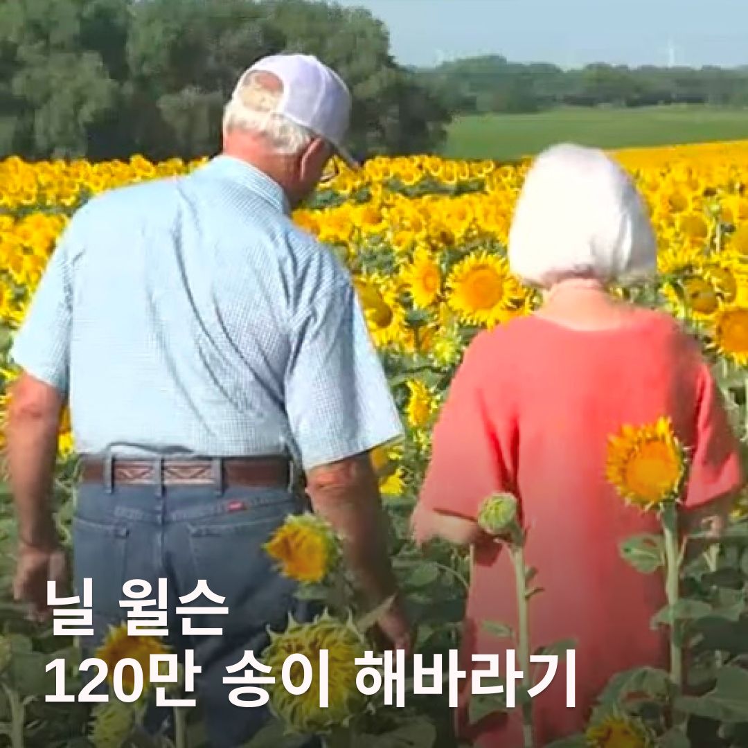 캔자스 주의 농부 윌슨은 결혼 50주년을 맞아 아내를 위한 깜짝 선물로 해바라기 밭을 준비했어요. 아내가 좋아하는 꽃인 해바라기를 무려 120만 송이나 심었죠. 32만 제곱미터의 드넓은 해바라기 밭은 마을 사람들 사이에서도 화제였다고 해요.