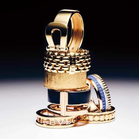 블랙 다이아몬드를 세팅한 블랙 티타늄 포스텐 브레이슬릿 300만원대, 옐로 골드 포스텐 윈치 링 300만원대 모두 프레드. 램스 헤드 브레이슬릿 가격 미정 스티븐 웹스터.