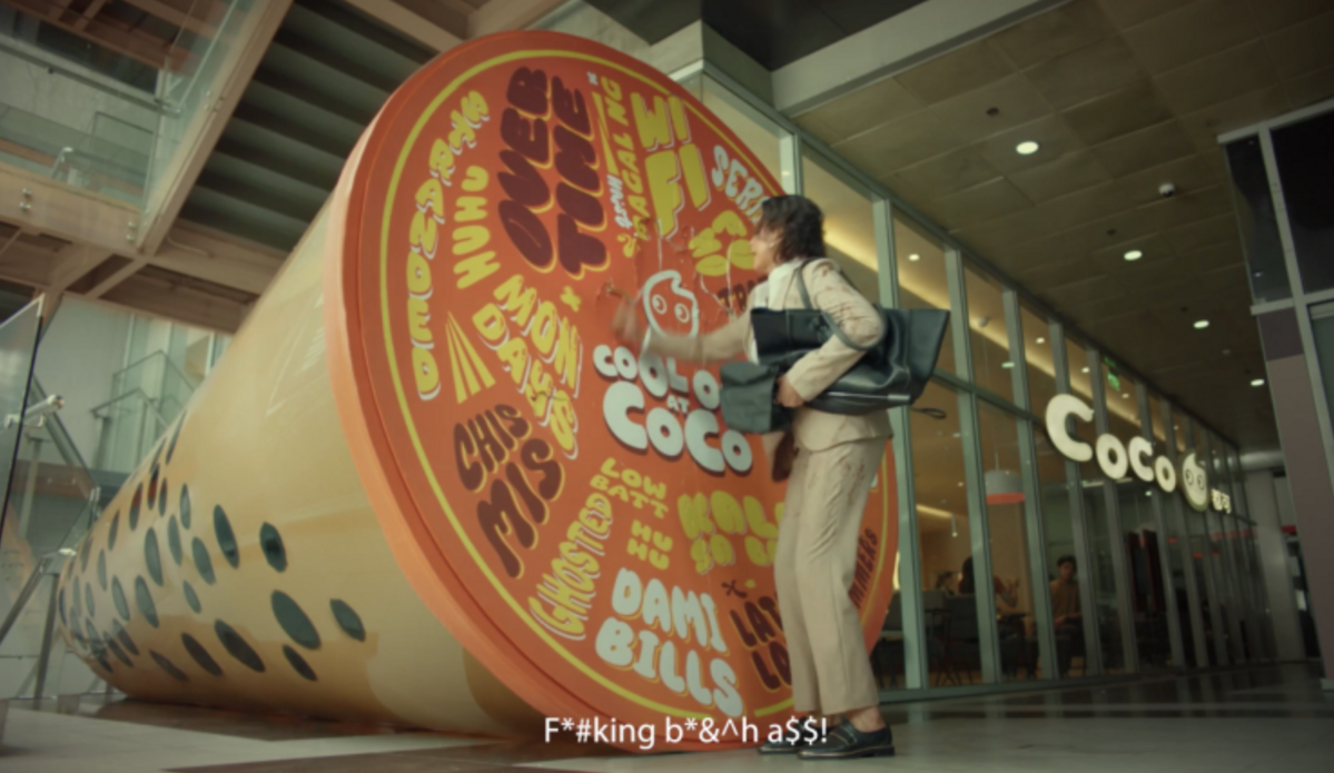 뾰족한 빨대를 뚜껑에 꽂으며 시원한 밀크티를 한 입 마셔 상쾌하게 스트레스를 날려버리라는 메시지를 담았습니다.