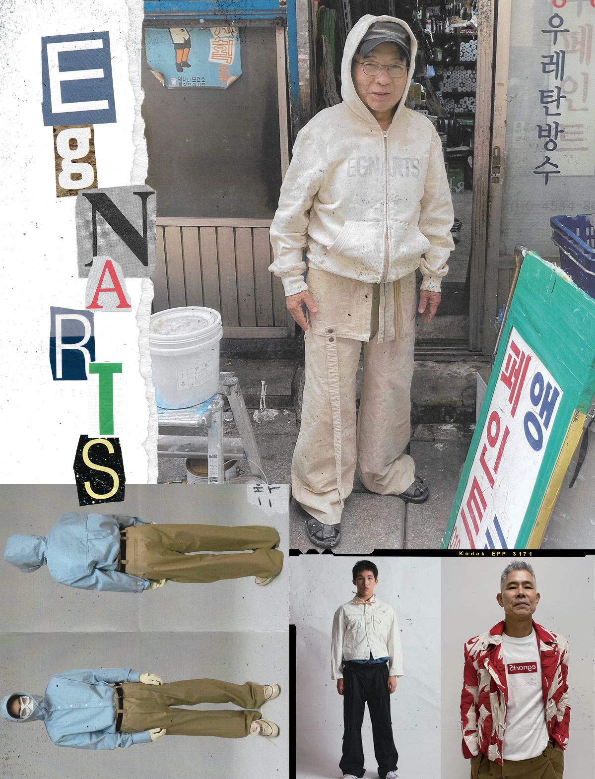 브랜드의 시작 SNS 웹 매거진을 운영했던 윤규석과 아카이브 계정을 운영했던 임채민이 만들었다. 이름의 의미 ‘Strange’ 스펠링을 뒤집어 발음하면 ‘Easy and art’가 된다. 낯설고 이상한 것을 뒤집어보면 쉬운 예술이 될 수 있다는 뜻을 담았다. 우리가 주목하는 가치를 많은 사람에게 알리기 위해 전시, 팝업 등 다양한 퍼포먼스를 진행하고 있다. 이지앤아트의 옷 발상을 뒤튼 상식 밖의 워크웨어. 우리가 만든 옷에는 전부 의미가 담겨 있다. 목장갑으로 라이더 재킷을 만든 것도 일상적인 사물과 그 속에 담긴 가치를 상기시키기 위해서다. 디자인 과정 우리 둘은 패션 비전공자다. 그래서 틀에 박히지 않은 자유로운 사고로 옷을 해석한다. 맨홀 뚜껑의 모양, 클랙슨이 울리는 원리… 아이디어를 구상할 때는 눈에 보이는 모든 것이 주제가 된다. 그러다 보면 무언가 선명히 그려진다. 이게 우리 컬렉션이 만들어지는 첫 단계다. 첫 컬렉션 주제는 휴머니즘. 식당, 세탁소와 같이 동네에서 흔히 볼 수 있는 가게의 어르신들을 모델로 세웠다. 점점 사라져가는 낡은 가게를 재조명하자는 취지로 시작했다. 공구를 걸 수 있는 바지나 목장갑으로 만든 재킷에 무심코 지나친 것들을 다시 들여다보자는 의도를 담았다. 영향받은 인물 우리 서로와 가족. 그리고 마틴 마르지엘라. 그의 아카이브는 여러모로 충격적이다. 평소의 우리 괴짜 같은 브랜드를 이끄는 사람들치고 꽤 조용한 편이다. 나서기를 좋아하지 않는다. 앞으로의 계획 ‘EASY’라는 새로운 라인을 전개할 예정이다. 우리의 의도를 훨씬 직관적이고 쉽게 전달하게 될 거다. 대중과의 소통을 위해 쇼룸, 팝업, 전시 등 오프라인 퍼포먼스도 많이 기획할 예정이다.