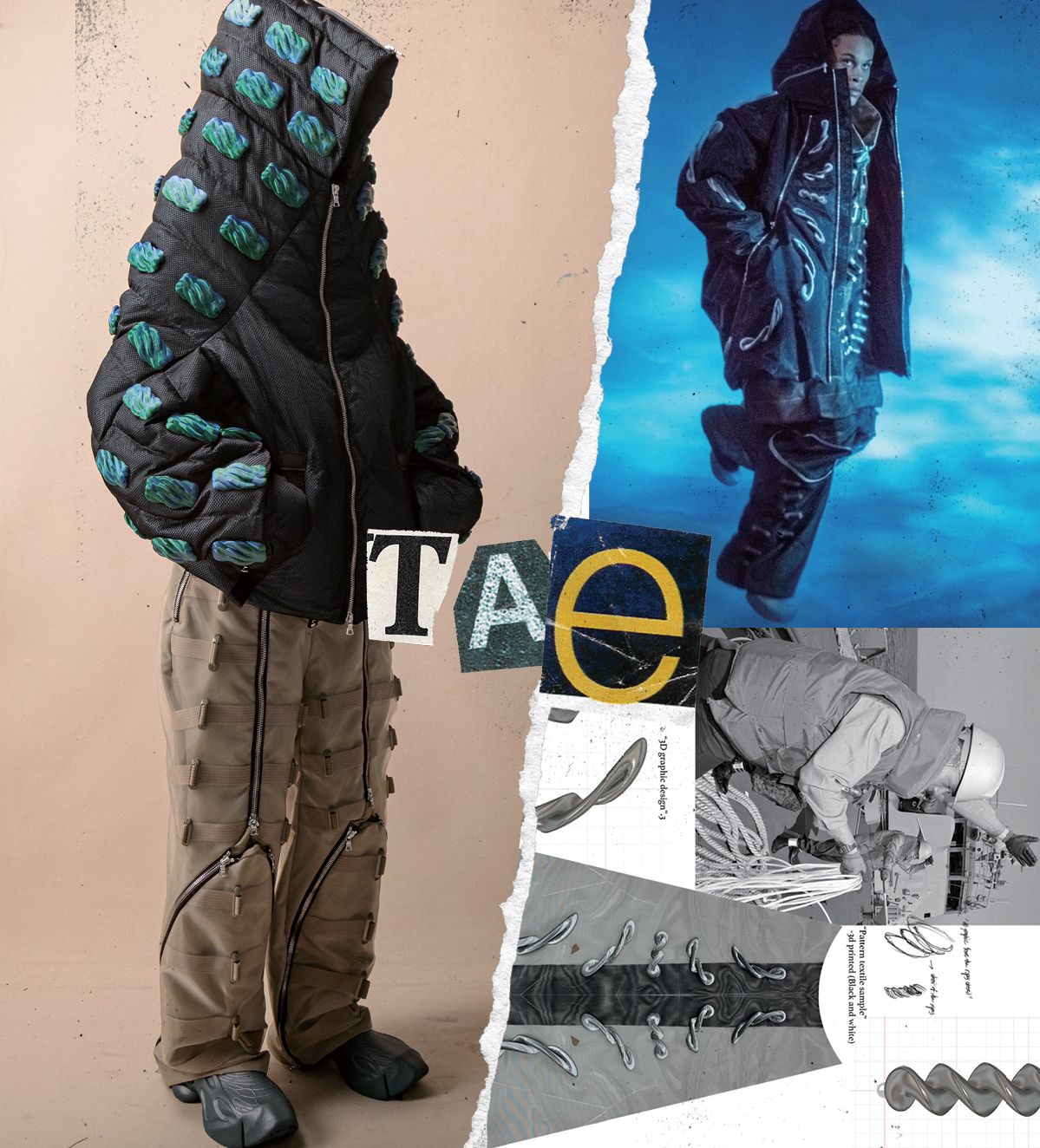 브랜드의 시작 졸업 컬렉션을 준비하며 3D 프린트를 활용한 컬렉션을 선보였다. 당시 긍정적인 평을 받았고 3D 프린트뿐만 아니라 다양한 기술을 접목한 옷을 계속 만들고 싶은 마음이 생겼다. 그게 타에의 첫 시작이었다. 3D 프린트를 선택한 이유 입체적으로 도드라지는 텍스타일에 관심이 있어 다양한 프로젝트를 시도했다. 하지만 전통적인 제작 방식으로 입체적인 텍스타일을 구현하는 데 한계를 느끼던 중, 3D 프린트로 의료기기를 만드는 사례를 접하게 됐고, 그걸 원단에 접목했다. 타에를 입는 방법 우리 옷에는 3D 프린트 텍스타일이 주는 특유의 인상과 색채가 있다. 그 특유의 컬러감에 맞춰 다른 아이템을 매치하면 보다 쉬울 거다. 보드화처럼 볼드한 슈즈를 신어 오버 실루엣을 극대화하거나, 팬츠는 곳곳에 있는 지퍼 디테일을 열고 닫아 다양한 실루엣을 연출해보는 것도 좋겠다. 영향받은 인물 이세이 미야케. 스티브 잡스에게 터틀넥을 만들어주고, 소니의 공장 유니폼을 디자인한 것. 다양한 분야와 협업을 통해 독창적이고 실용적인 디자인을 선보이던 그의 디자인적 사고에서 많은 것을 배웠다. 뮤지션으로는 한스 짐머. 여러 장르를 넘나들면서 늘 새로운 방식으로 음악을 작곡해서 좋다. 계속해서 새로운 것을 도전하는 모습에서 자극을 받는다. 앞으로의 계획 3D 프린트 머신 회사와 협력한 옷을 곧 선보일 예정이다. 최첨단 기술을 적용해 매년 발전되는 자동차나 휴대폰처럼 끊임없이 진화하고 싶다.
