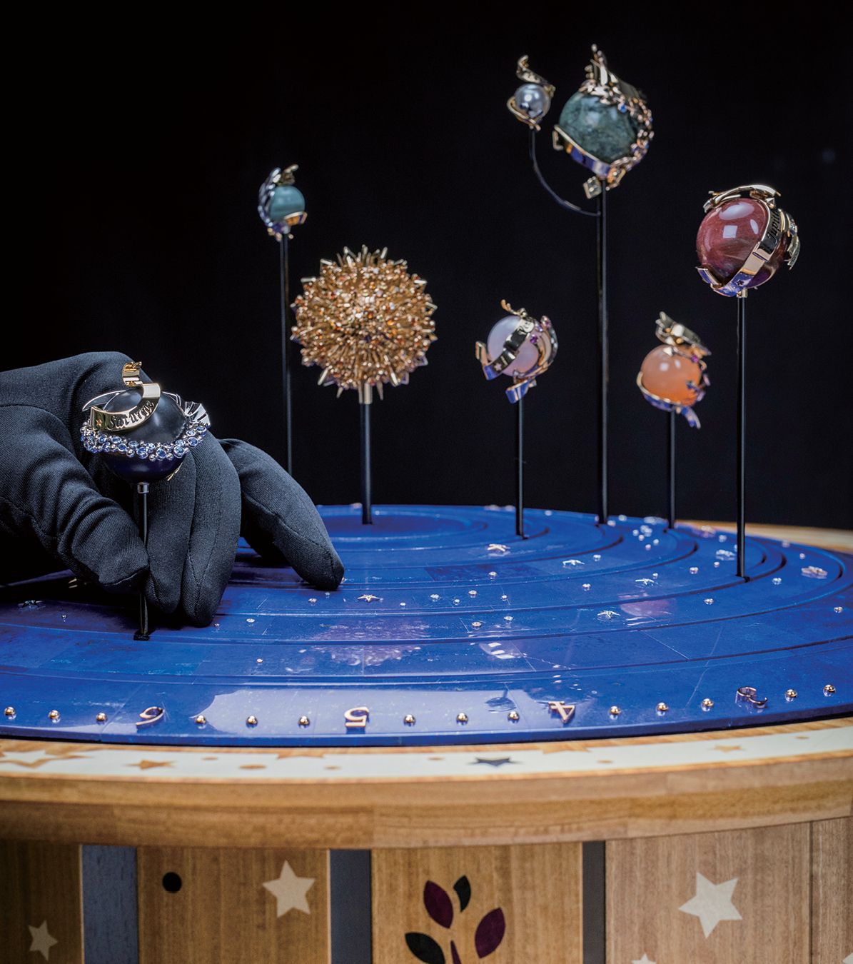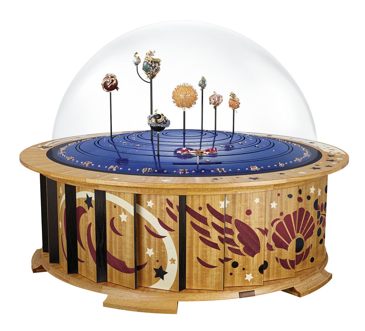 」반클리프 아펠의 시적인 미학과 정교한 워치메이킹 기술이 완벽한 조화를 이뤘다. ‘플라네타리움 오토마톤’은 단순한 기계장치를 넘어 예술 작품이라 부를 만한 테이블 오토마톤이다. 높이 50cm, 지름 66.5cm 크기로 태양과 지구에서 관측할 수 있는 행성들을 실제 공전 속도에 맞춰 정교하게 구현했다. 이 장대한 움직임은 퍼페추얼 캘린더, 파워 리저브 인디케이터 등 11개의 컴플리케이션과 15일 파워 리저브를 갖춘 핸드와인딩 무브먼트를 통해 가능해졌다. 오토마톤이 작동하면 숨겨진 문에서 유성이 나타나 밤하늘을 가로지르며 시간을 표시한다. 유성이 행성들을 이끌며 별들의 움직임은 마치 한 편의 발레 공연 같은 장관을 연출하고, 동시에 15개 작은 종이 울리며 신비로운 카리용 멜로디가 흘러나온다. 각 행성은 문스톤, 라피스 라줄리, 재스퍼 등으로 완성했으며, 태양은 500개의 골드 스템 위에 스페사르타이트 가닛, 옐로 사파이어, 다이아몬드 등을 세팅해 블랙 어벤츄린 글래스 디스크 위에서 찬란한 빛을 발산한다. 예술성과 장인정신이 집약된 플라네타리움은 정교하게 맞물린 모든 요소가 마법처럼 어우러져, 우주의 서사와 시간의 아름다움을 테이블 위에 서정적으로 펼쳐낸다.