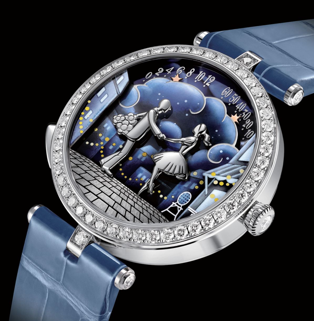 」반클리프 아펠이 전하는 러브스토리를 감상하고 싶다면 이 시계를 들여다보면 된다. 올해 새롭게 공개한 ‘레이디 아펠 발 데 자모르 오토메이트 워치’가 그 주인공. 기존 ‘퐁 데 자모르’ 모델이 다리 위에서 만나는 연인의 모습을 담았다면, 이번에는 파리의 갱게트(Guinguette)를 배경으로 삼았다. 갱게트는 19세기 프랑스에서 유행한 야외 무도회로, 술과 춤이 어우러진 낭만적인 장소다. 시간은 더블 레트로그레이드 방식으로 구름 위에 위치한 두 개의 별이 표시한다. 하이라이트는 정오와 자정, 두 사람이 손을 맞잡고 서로에게 기대어 입맞춤하는 순간이다. 낭만적인 입맞춤은 3분간 이어진다. 반클리프 아펠은 더욱 자연스럽고 우아한 동작을 구현하기 위해 4년에 걸쳐 새로운 오토마톤 무브먼트를 개발했다. 물론 이 장면을 12시까지 애타게 기다릴 필요는 없다. 8시 방향의 푸셔를 누르면 온-디맨드 애니메이션 기능이 활성화된다. 지름 38mm의 화이트 골드 케이스에는 다이아몬드를 세팅해 눈부신 광채를 더했으며, 다이얼은 그리자유(Grisaille) 에나멜링 기법을 활용해 빛과 어둠의 대비를 섬세하게 표현했다.