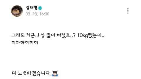 오는 6월 10일 제대를 한 달 여 남짓 남긴 방탄소년단 뷔. 팬들과의 소통 창구인 위버스에 10kg 감량과 벌크업한 근황을 올렸다. 그는 헬스장에서 찍은 듯한 사진을 업로드 하며, “그래도 최근! 살 많이 빠졌죠? 10kg 뺐는데. 하하하. 더 노력하겠습니다”라며 군 복무 중임에도 열심히 몸매를 관리하는 일상을 업로드했다. 뷔는 같은 방탄소년단 멤버인 RM과 같은 날 입대해 오는 6월 10일 동반 제대를 할 예정이다. 또한 지민과 정국은 오는 6월 11일 제대. 사회복무 요원으로 근무 중인 슈가는 21일 제대하여 다음 달이면 방탄소년단의 완전체 모습을 볼 수 있을 듯!