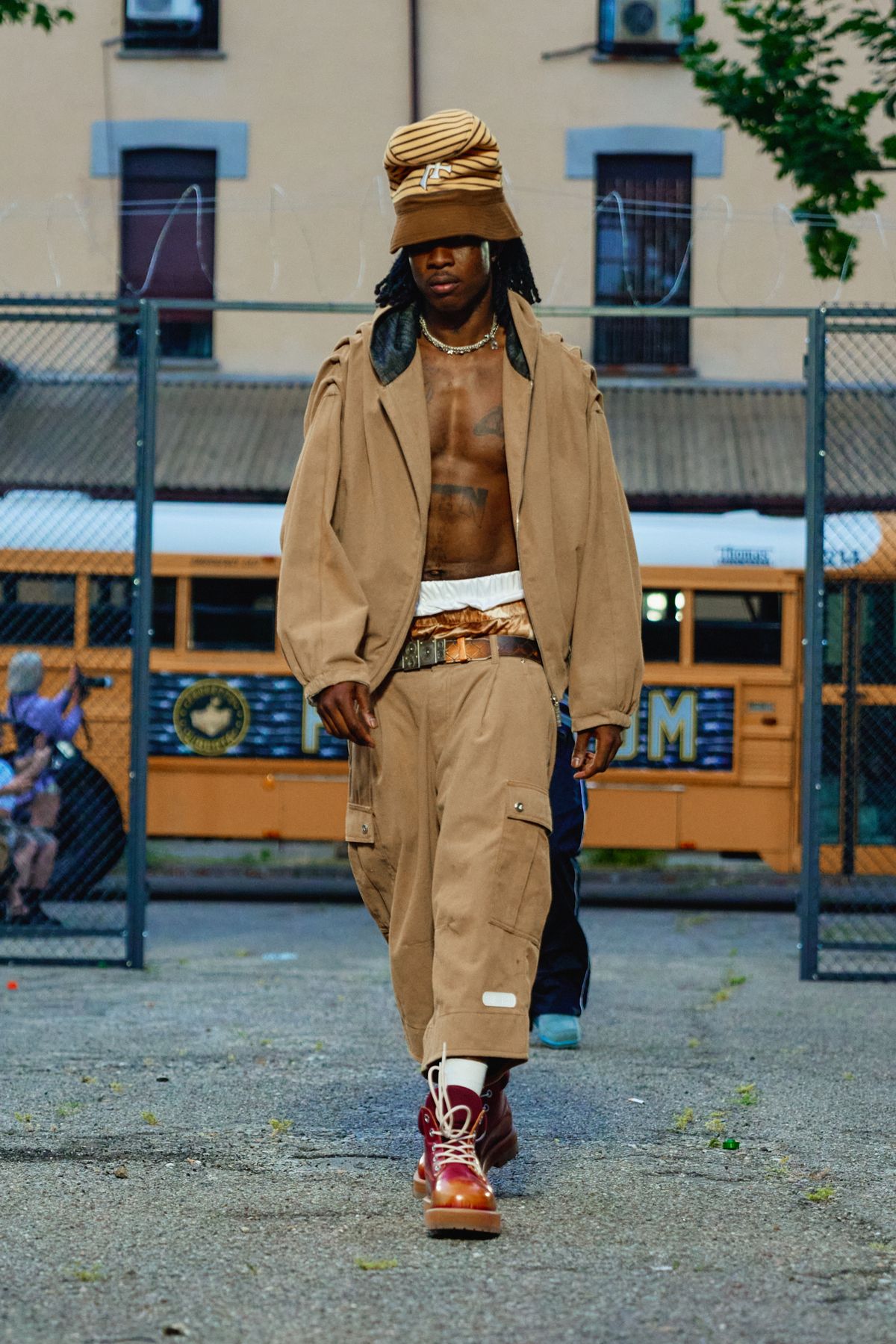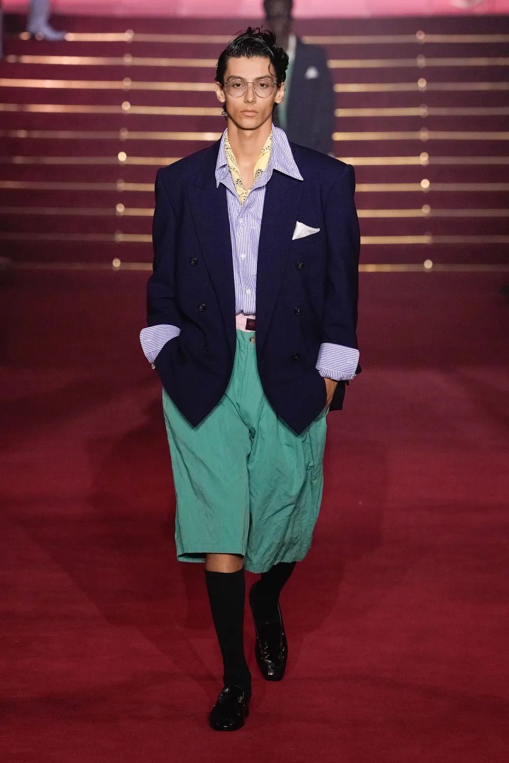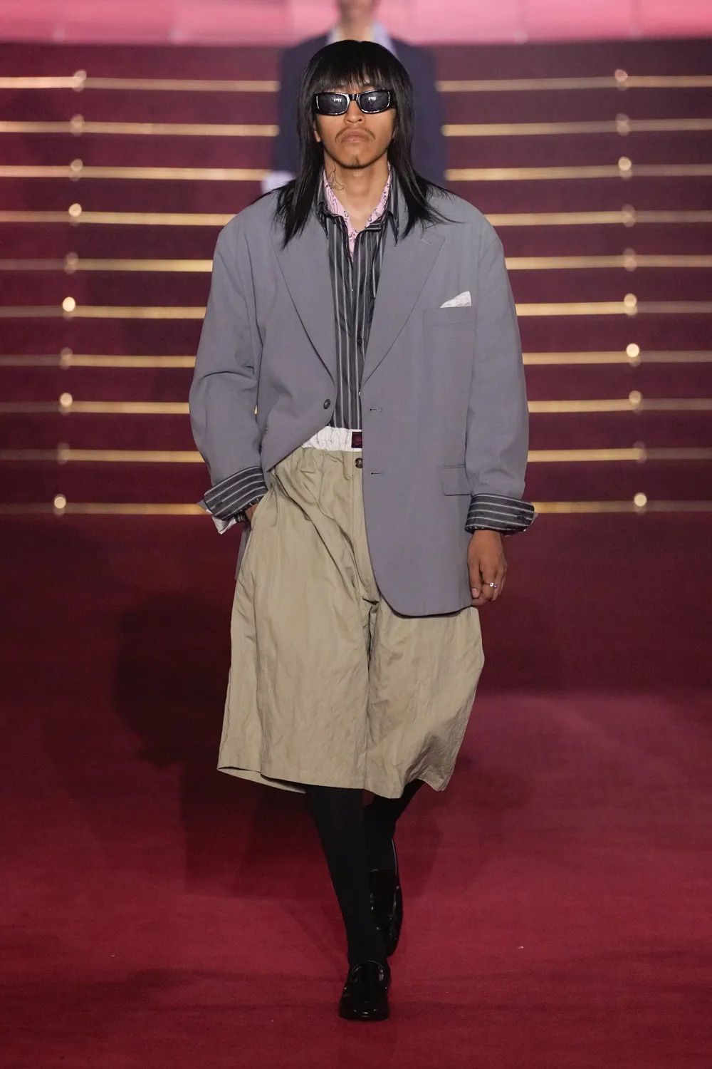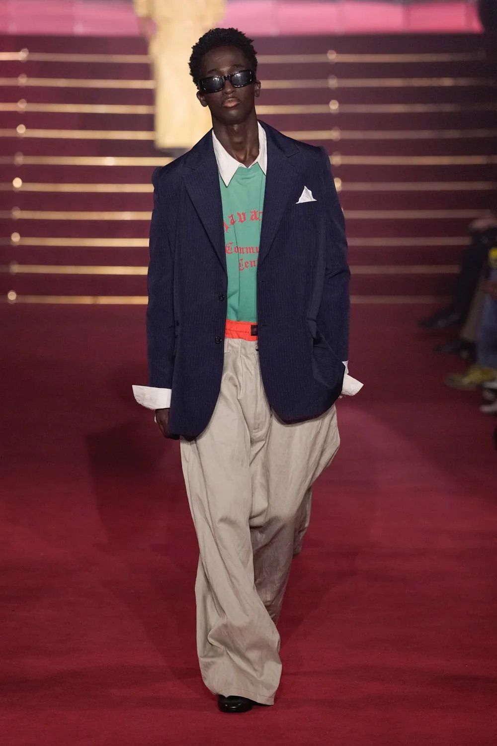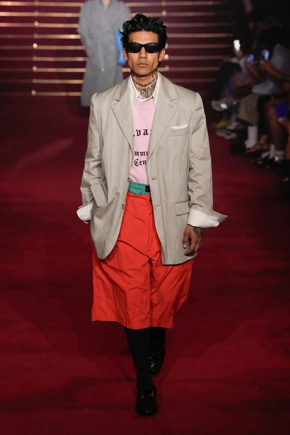 윌리 차바리아(Willy Chavarria)는 캐주얼한 수트 스타일링에 새깅을 접목했다. 보통 스트리트에서만 보던 새깅을 포멀한 테일러드 룩에 녹여내 반전 매력을 선보인 것이다. 이렇게 포멀한 룩에 새깅을 더할 때는 바지를 한껏 내리기보다 적당히 로웨이스트 팬츠를 선택하는 편이 현명하다. 그리고 위트를 더한 스타일링을 하고 싶다면 컬러풀한 복서를 활용해보자. 톤온톤으로 자연스럽게 연결해도 멋스럽고, 과감히 대비를 줘도 좋다. 마지막으로 상의를 복서에 과감하게 턱인(tuck-in)하는 디테일까지 챙기는 것도 좋은 방법이 될 것이다.