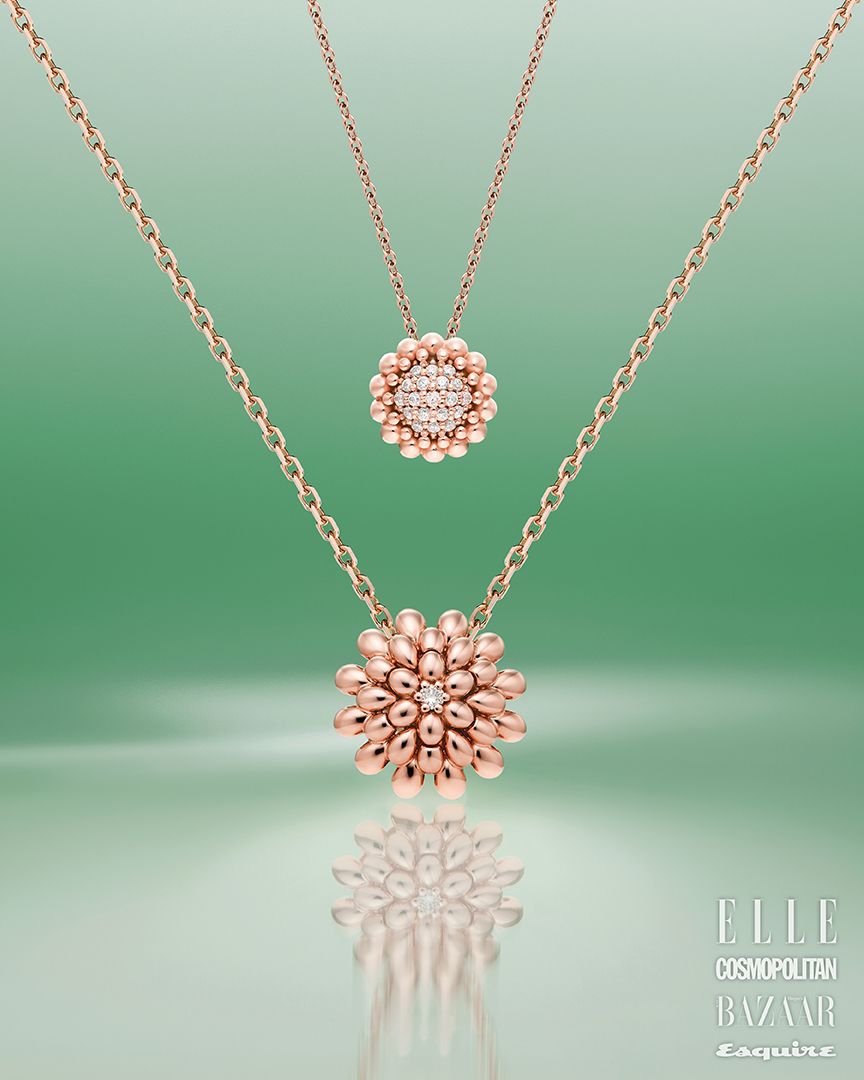 작고 풍성한 실루엣으로 산딸기의 무드를 표현한 핑크 골드 소재의 루벨 목걸이는 88만원, 산딸기의 풍성한 형태를 생동감 있게 담아낸 루벨리아 다이아몬드 펜던트는 69만원, 펜던트를 더욱 돋보이게 하는 펠코너 체인 네크리스는 70만원 모두 ROSEED’OR.