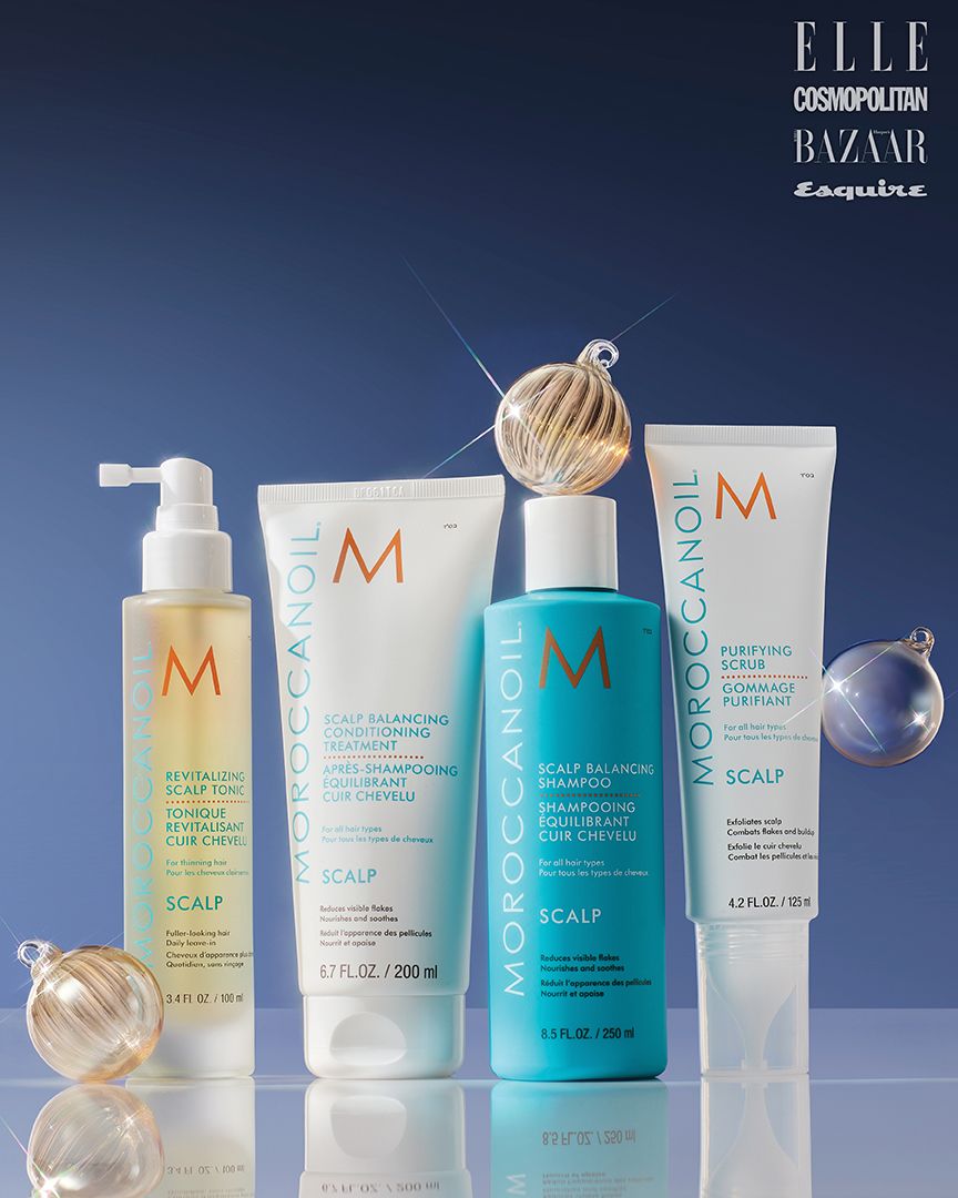 (왼쪽부터) 리바이탈리이징 스칼프 토닉 100ml 6만3천원, 스칼프 밸런싱 컨디셔닝 트리트먼트 200ml 3만9천원, 스칼프 밸런싱 샴푸 250ml 3만9천원, 퓨리파잉 스크럽 125ml 4만9천원 모두 MOROCCANOIL.