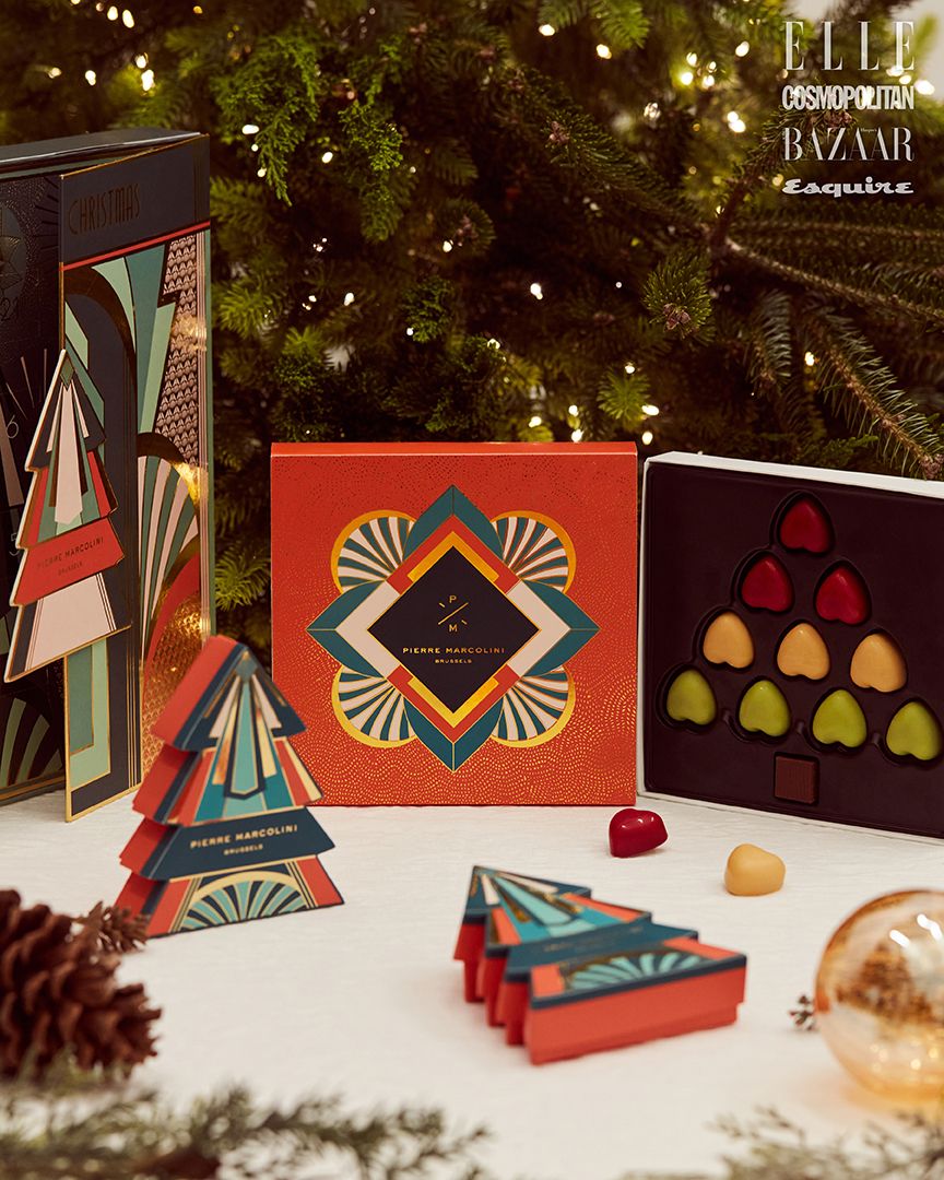 피스타치오, 라즈베리 등 서로 다른 네 가지 맛으로 구성한 초콜릿 세트. 시그너처인 하트 초콜릿으로 트리 모양을 연출한 노엘 셀렉션은 6만원대 모두 PIERRE MARCOLINI.