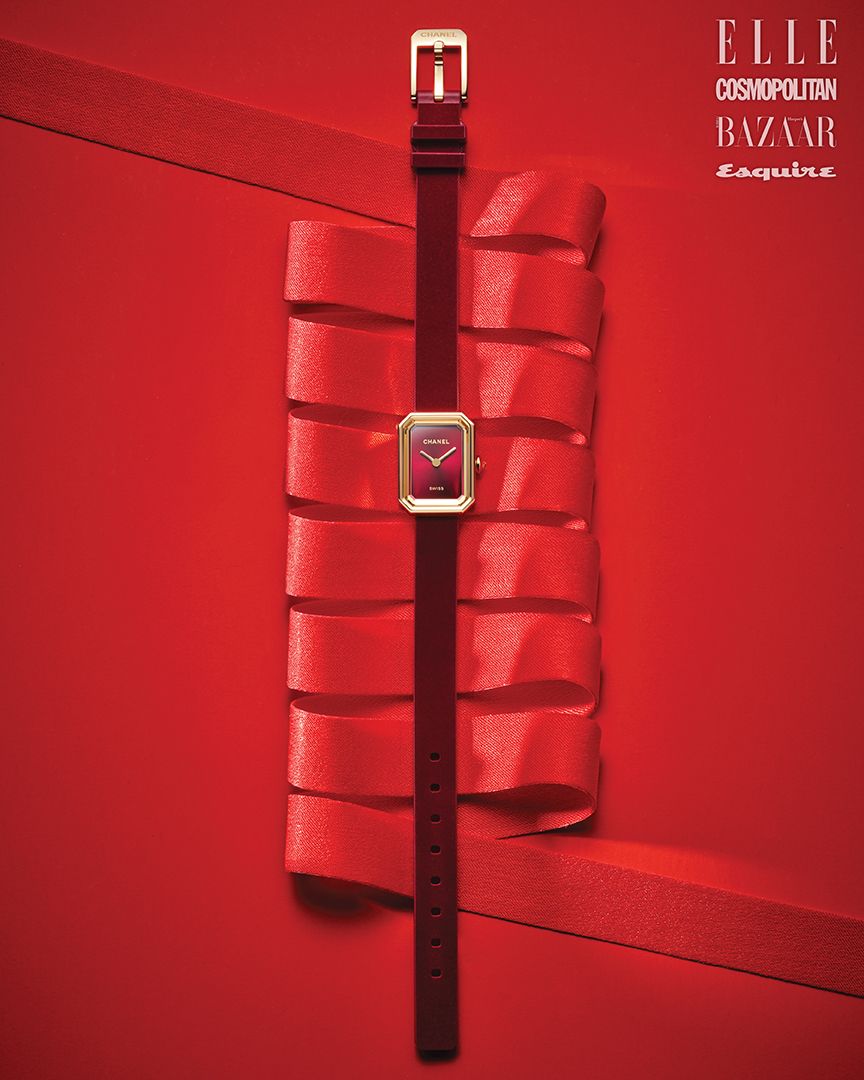 벨벳 장식의 레드 스트랩에 레드 래커 다이얼과 옐로 골드 베젤을 매치한 프리미에르 리본 레드 워치는 가격 미정 CHANEL WATCHES.