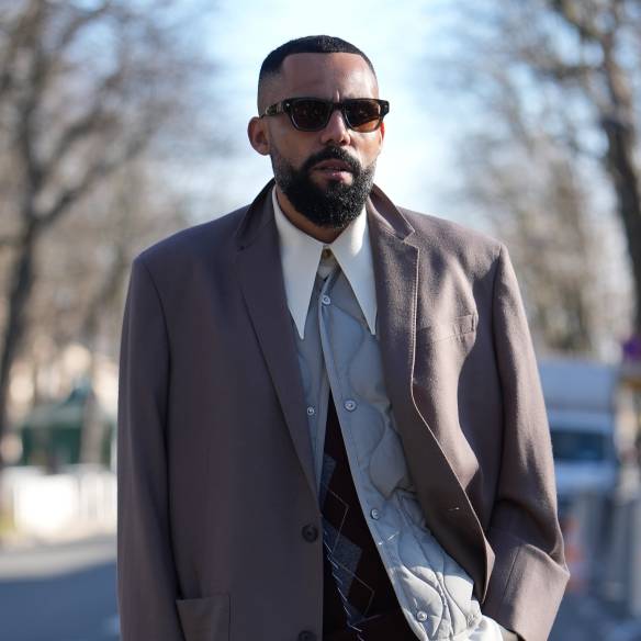 자타공인 '옷잘알' 코드 쿤스트 역시 각기 다른 두 가지 소재를 섞어 과하지 않으면서도 멋스러운 룩을 연출했습니다. 빈티지한 무드의 오버사이즈 레더 재킷 안에 플리츠 소재의 후디를 레이어드해 고급스러움과 분위기를 동시에 잡았는데요. 자연스러운 광택이 느껴지는 레더 소재와 매트한 플리츠 소재가 어우러지며 밋밋한 룩에 리듬감을 더합니다. 재킷 소매 밖으로 후드의 소맷단을 살짝 빼 스타일링의 완성도를 높이는 디테일까지 놓치지 않은 그. '옷잘알'이라는 타이틀이 아깝지 않은 패션 센스를 보여줬습니다.