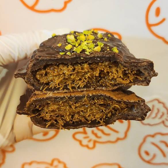 가게 오픈 전, 오픈을 기다리는 웨이팅 줄이 너무 길게 늘어서 당일 마감 공지가 올라올 정도로 엄청난 인기를 자랑하는 곳! 피스타치오 페이스트에 벨기에산 커버춰 화이트 초콜릿, 카다이프, 쫀득 퐁신한 마시멜로를 레이어링 한 뒤 발로나 코코아 파우더 등 질 좋은 재료를 아낌없이 사용해 만듭니다.