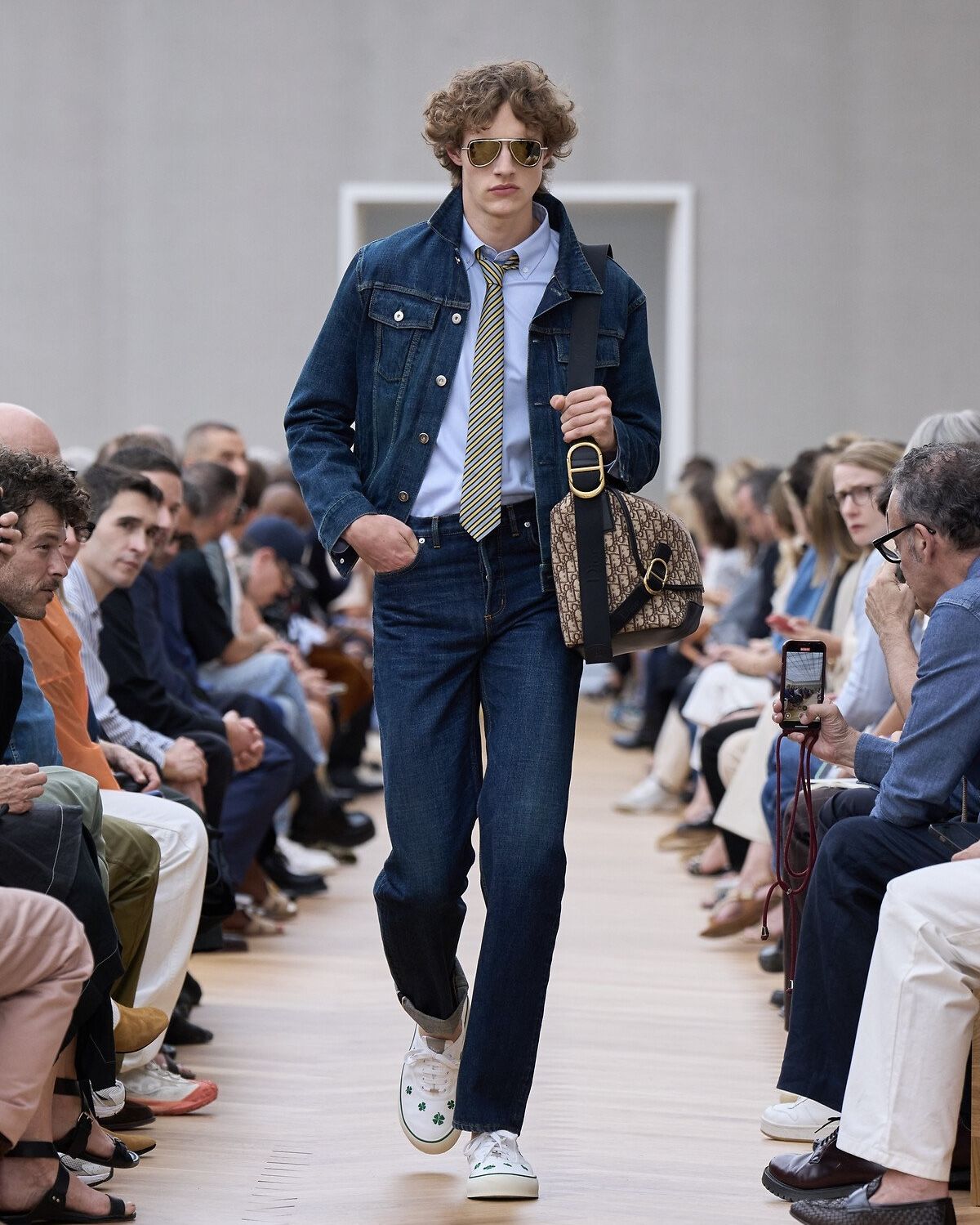 」디올이 제시한 청청 패션의 핵심은 단연 균형감입니다. 과하지 않게 여유를 남긴 말끔한 실루엣, 호불호가 크게 갈리지 않는 짙은 데님 컬러 그리고 어디 하나 찢지 않은 깔끔한 마무리까지. 힘을 주고 빼는 지점을 정확히 짚어낸 스타일링이죠. 여기에 느슨하게 매치한 스트라이프 타이와 앙증맞은 클로버 디테일의 스니커즈를 더해, 자칫 단조로울 수 있는 청청 룩에 경쾌한 변주를 만들어냈습니다.