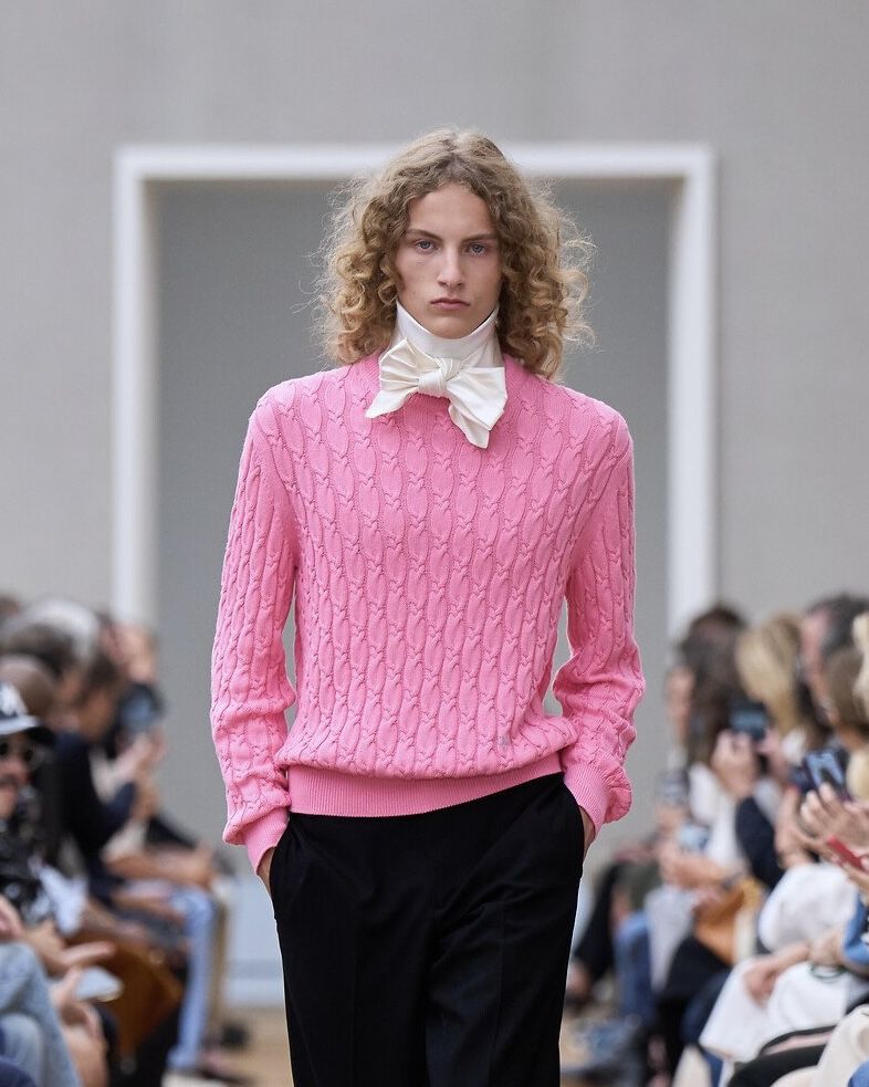 」클래식한 꽈배기 니트 짜임 위에 입혀진 산뜻한 핑크 컬러는 보는 순간 기분까지 환기시킵니다. 촘촘하게 짜인 소매와 밑단 디테일은 실루엣을 단정하게 잡아주죠. 또 보타이 스타일링을 더해 조나단 앤더슨 특유의 위트와 소년적인 감성을 놓치지 않았습니다. 분명 익숙한 디자인이지만, 클래식과 유머, 전통과 변주의 조화를 상징적으로 보여주는 룩이라 할 수 있죠.