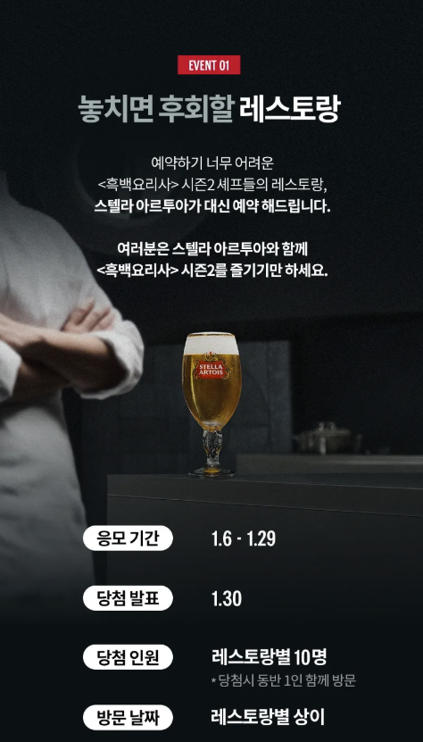 앞서 언급한 흑백요리사 출연자 레스토랑 식사권 증정 이벤트는 이 협업의 백미다. ‘키친보스’ 김호윤 셰프의 ‘더 이탈리안 클럽’, ‘서촌황태자’ 이재훈 셰프의 ‘까델루뽀’, ‘유행왕’ 김훈 셰프의 ‘쌤쌤쌤’, ‘파스타스타’ 임홍근 셰프의 ‘파티나’ 등 총 5개 레스토랑 이 참석한다. 1월 6일부터 1월 29일까지 지정된 매장에서 스텔라 아르투아 생맥주 2잔을 구매하거나 온라인에서 1월 9일부터 편의점 픽업 상품인 '스텔라 아르투아 다이닝 에디션'을 구매하면 응모권을 증정한다. 응모자를 대상으로 1월 30일 당첨자를 발표한다.