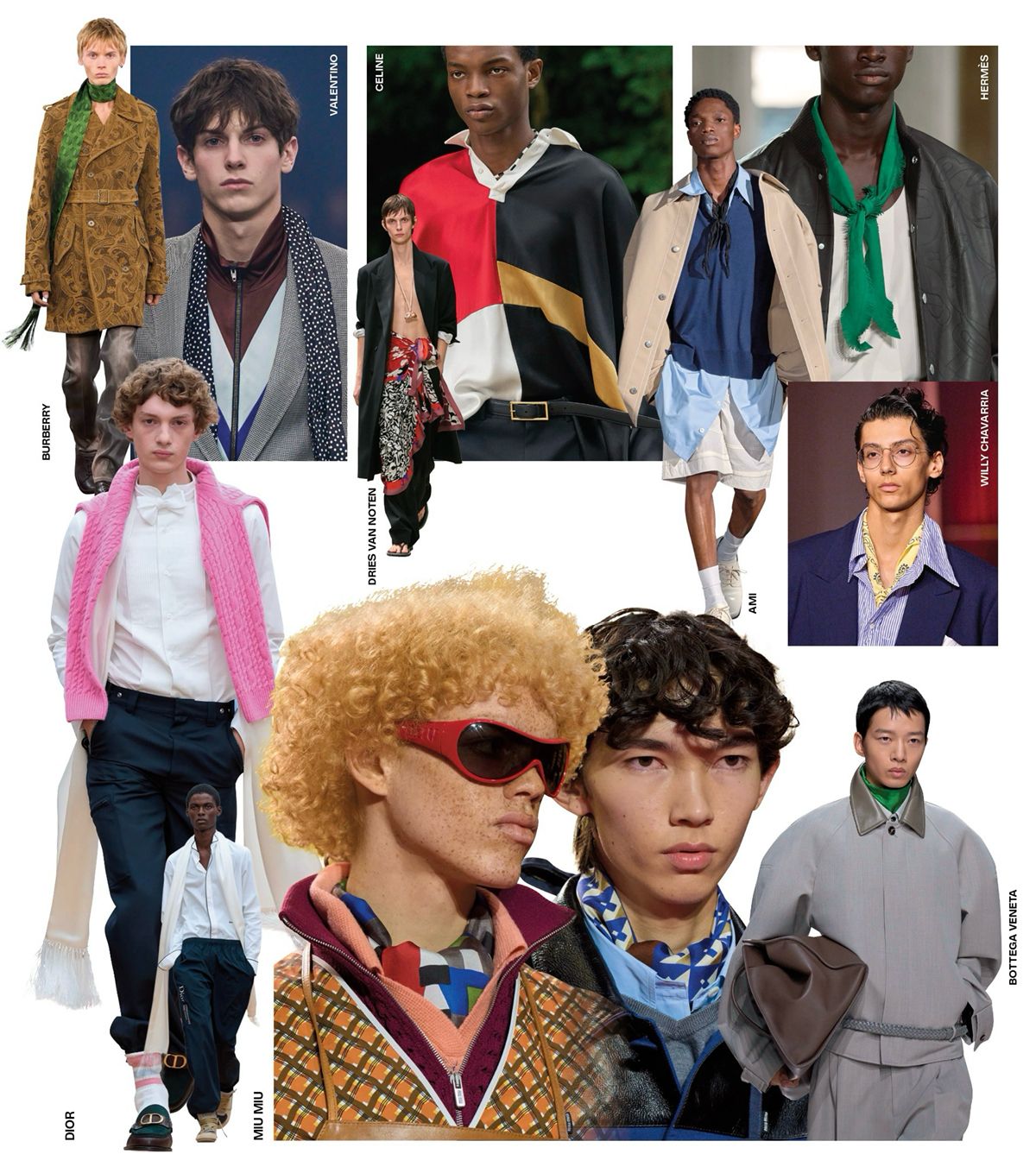 한동안 눈길을 주지 않았던 스카프에 다시 시선이 간다. 2026 S/S 남성복 컬렉션에서 조용하지만 분명하게 자기 역할을 했기 때문. 다만 묶는 방식이나 길이, 색과 패턴, 스타일링에 따라 분위기는 달랐다. 에르메스와 윌리 차바리아, 아미는 명확한 색의 짧은 까레 스카프를 프렌치 노트로 매 명랑하고 낭만적인 룩을 연출한 반면 미우미우, 보테가 베네타는 실크 스카프를 묶은 다음 셔츠 안쪽으로 새초롬하게 넣어 절제된 스타일링을 보여줬다. 한편 드리스 반 노튼은 과감한 플로럴 패턴 스카프를 팬츠 위에 둘러 새로운 실루엣을 제안하기도 했다. 스카프를 이어 붙여 만든 듯한 디자인으로 스카프를 재해석한 셀린느의 방식도 새로웠다. 그럼에도 가장 간편하고 우아한 해답은 디올, 버버리, 발렌티노처럼 스카프를 길게 늘어뜨리는 것. 걸음마다 나부끼는 모양도 아름답지만 무엇보다 윤기 나는 고급 실크를 무심한 태도로 대하는 모습이 좋다.