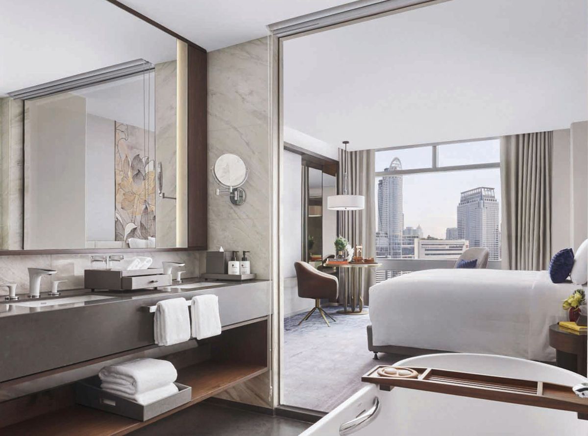 호텔은 트윈 타워 구조로 총 582개의 객실과 스위트를 갖추고 있다. 디럭스룸은 46㎡ 크기부터 시작해서, 가장 넓은 321㎡ 펜트하우스까지 다양한 옵션이 준비되어 있어 선택의 폭이 넓다. 모든 객실에는 도시가 한눈에 들어오는 대형 통창과 고급스러운 대리석 욕실이 갖춰져 있어 쾌적하게 머물 수 있으며, 태국 럭셔리 웰니스 브랜드 판퓨리 어메니티를 제공한다.