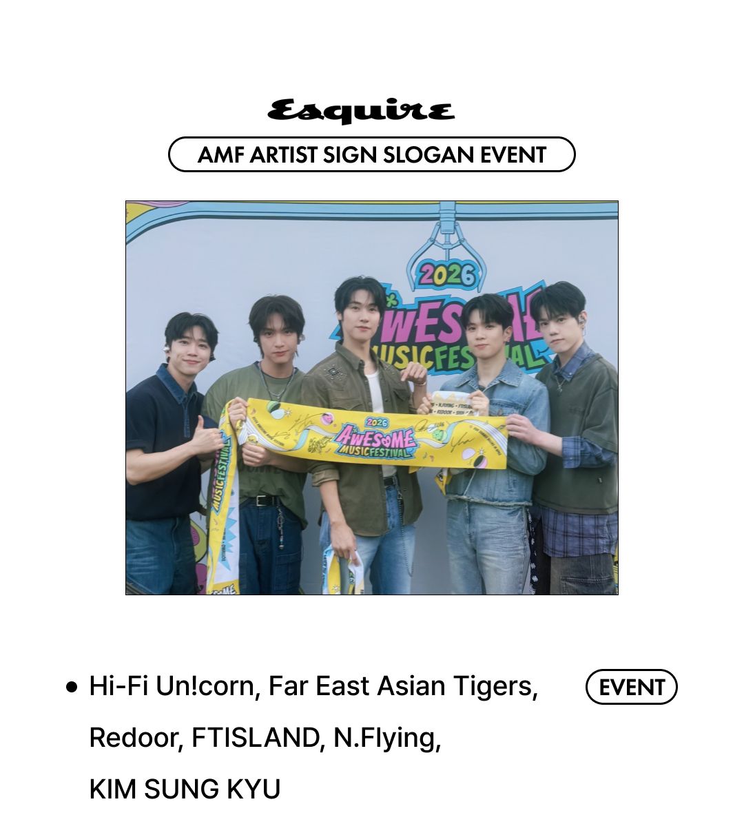 어느덧 성큼 다가온 여름과 함께 지난 4월 25일, 난지한강공원에서는 2026 어썸뮤직페스티벌이 열렸습니다. 아티스트와 관객이 하나 되어 마음껏 뛰어놀고 음악을 즐기며, 잠시나마 일상에서 벗어나 해방감을 만끽했죠. 페스티벌은 막을 내렸지만, 그 여운을 오래도록 곱씹을 수 있도록 에스콰이어가 백스테이지 포토와 인터뷰를 담아왔습니다. 스크롤을 내려 그날의 이야기를 다시 만나보고, 기사 하단에서 아티스트의 친필 사인이 담긴 공식 MD 증정 이벤트에도 참여해 보세요.
