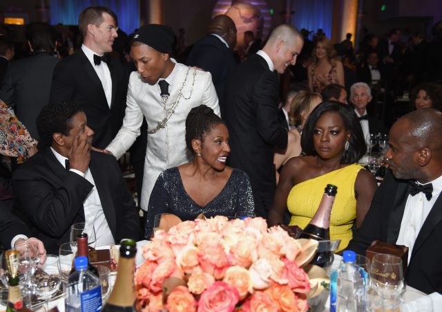 올해에도 유감 없이 블랙 파워를 보여준 배우들이 나란히 앉아 있군요. 영화 <펜스>로 영화 드라마 남우주연상 부문에 노미네이트된 덴젤 워싱턴이 세계적인 팝스타 패럴 윌리엄스와 대화를 나누고 있네요. 그리고 덴젤 워싱턴의 아내 파울레타 워싱턴과 영화 <펜스>로 영화 여우조연상을 수상한 비올라 데이비스가 나란히 앉아 있군요.