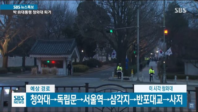 청와대 앞에서 어떤 식으로든 탄핵 인용에 관한 대국민 담화를 할 것이라는 기대는 솔직히 크진 않았다. 박 전 대통령 일행은 예상을 깨고 광화문에서 사직터널 방향으로 직진해버렸다. 삼성동 사저로 가려면 광화문에서 좌회전을 해서 세종로를 지나 서울역으로 향하는 게 최단 경로다. 사직터널을 지나 독립문 앞에서 좌회전을 하려는 순간 박 전 대통령의 의도가 드러났다.