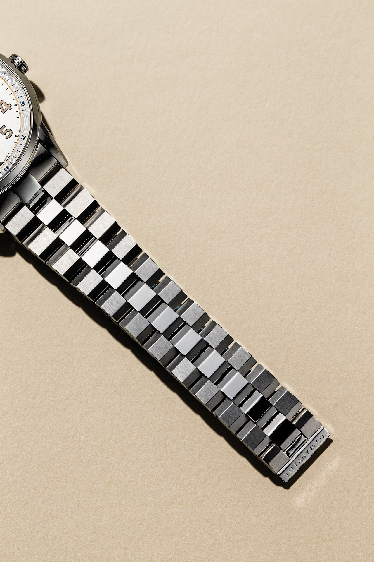 브레이슬릿 보석의 아름다움은 반사광에서 온다. 티파니는 그걸 다루는 법을 너무 잘 안다. 빛에 대한 통찰은 CT60의 브레이슬릿에서도 드러난다. 티파니는 여느 시계 브랜드와 달리 브레이슬릿을 이루는 조각의 위아래를 깎았다. 반사광을 받을 부분이 넓어진다. 더 반짝거리고 잘 보인다. 영리하다.