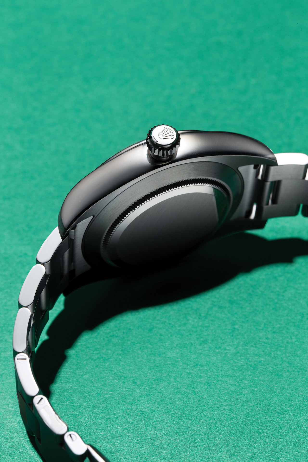 두께 로고가 변화라면 두께는 보수다. 롤렉스는 얇은 시계를 만든 적이 없다. 사진을 보면 측면의 곡선을 잘 살려 두께가 얇아 보이지만 사실은 뒤에 볼록 나온 부분만큼 더 두꺼운 걸 알 수 있다. 이 두께로 롤렉스는 방수 성능과 작동 안정성을 얻는다. 100미터 방수가 되고 일 오차는 2초다.