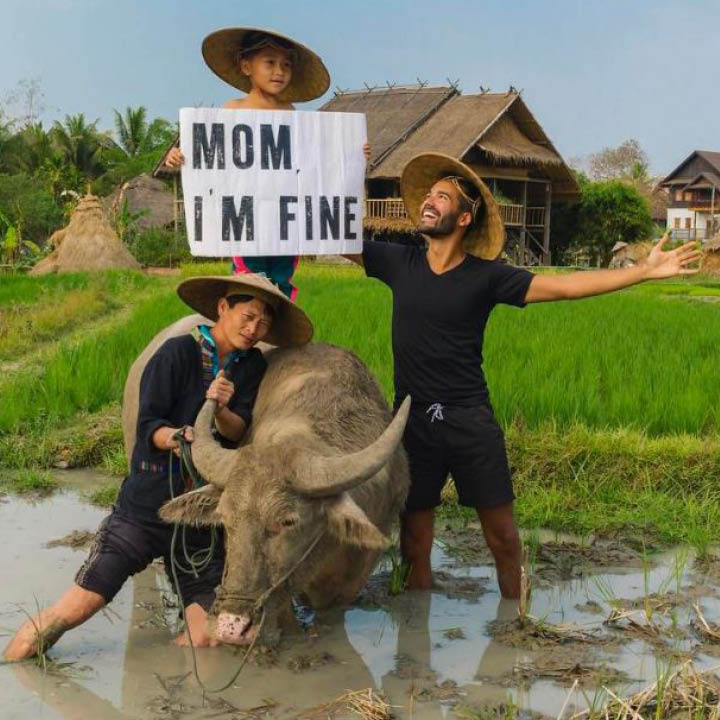 그는 차를 팔고 남아메리카 쿠바 행 비행기 표를 샀고 그만의 세계 여행을 시작했다. 단 하나의 문제는 바로 그의 어머니. 아들이 안전한지에 늘 걱정하고 불안해하는 어머니를 안심시켜야 했다. 와이파이나 전화 통신 상태가 좋지 못한 곳에서는 어머니에게 안부를 전하기가 어려워 그는 인스타그램 계정(@momimfine)을 이용하기로 했다.