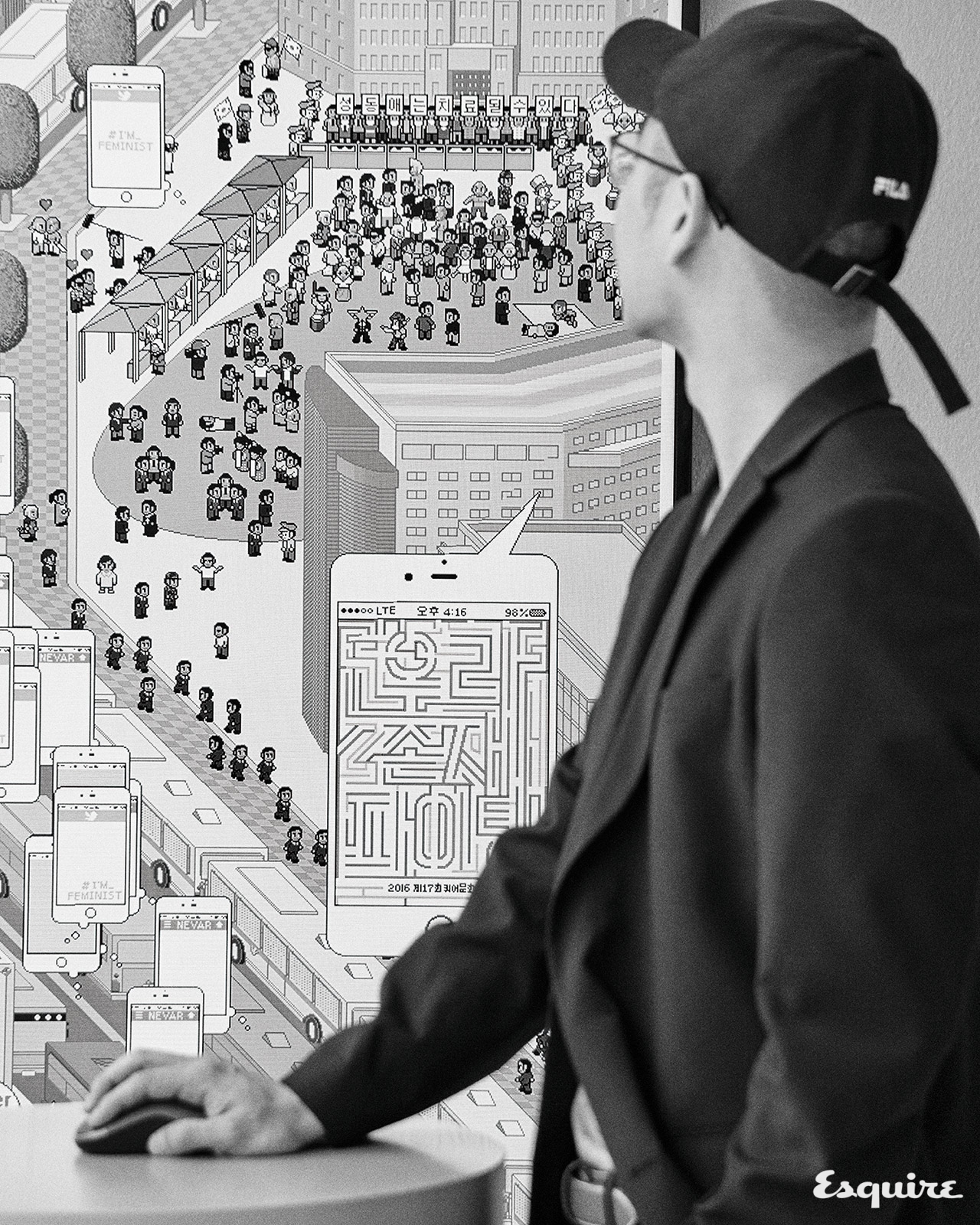 신_그러고 보니 이번에 전시된 <가장 평면적인 것이 가장 정치적이다> 역시 쿼터 뷰네요. 전략 시뮬레이션 게임처럼. 그러니까 점이라는 방식의 민주적 속성과 쿼터 뷰라는 권력적 속성이 충돌하고 있달까. 작품 안에서 벌어지는 수많은 사건도 결국 그런 수평과 수직의 충돌이 빚어낸 것들이고. 강남역 살인 사건처럼.