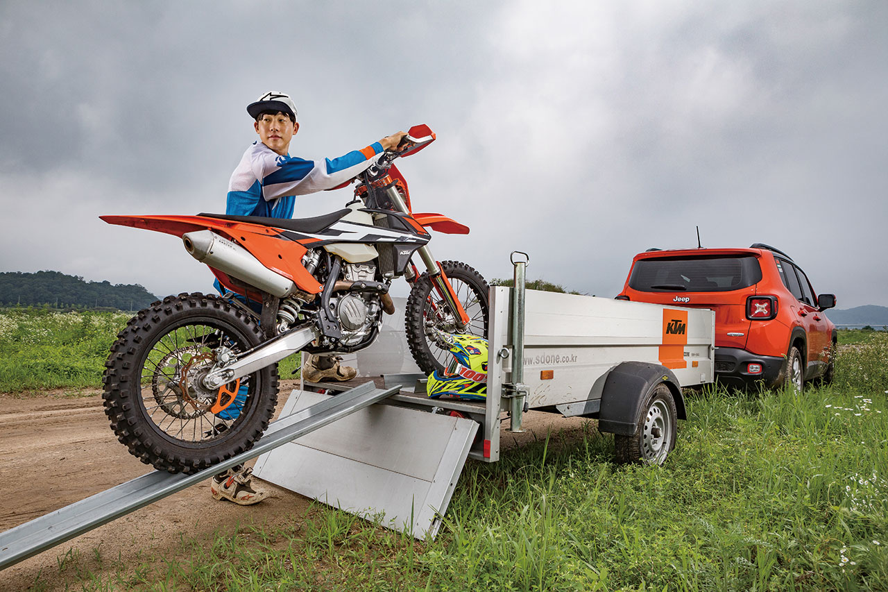 애초에 투어가 아니니까 집에서부터 모터사이클을 타고 가진 않는다. 싣고 간다. 자동차에 카고 트레일러를 달고 엔듀로 바이크를 싣는다. 자동차의 장점과 모터사이클의 장점을 모두 경험하는 순간이다. 차에 타 시원하게 에어컨을 틀고, 신나는 음악도 듣는다. 두 바퀴를 즐기는 과정이 이렇게 쾌적한 경우도 드물다.서울에서 1시간 30분을 달려 남한강이 옆으로 흐르는 양평의 한 들판에 차를 세운다. 모터사이클을 내리고 엔듀로 전용 기어를 온몸에 두른다. 갑자기 몸속에 에너지가 넘친다.
