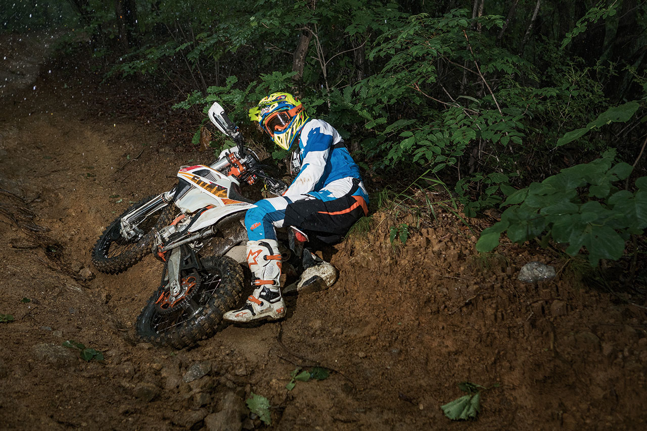‘우당탕탕!’ 눈앞에 별이 번쩍하고 보였다. 산길에 막 진입해 속도를 올릴 때였다. 물길로 흙이 팬 곳을 피하지 못하고 미끄러지며 곧바로 바이크와 함께 바닥으로 넘어졌다. 꽤 빠른 속도에서 넘어졌는데 250 EXC-F도 나도 멀쩡했다. 오프로드에서 이런 일은 일상다반사다. 물론 안전 장비 덕분에 전혀 다치지 않았다. 모터사이클에도 흠집 하나 생기지 않았다.