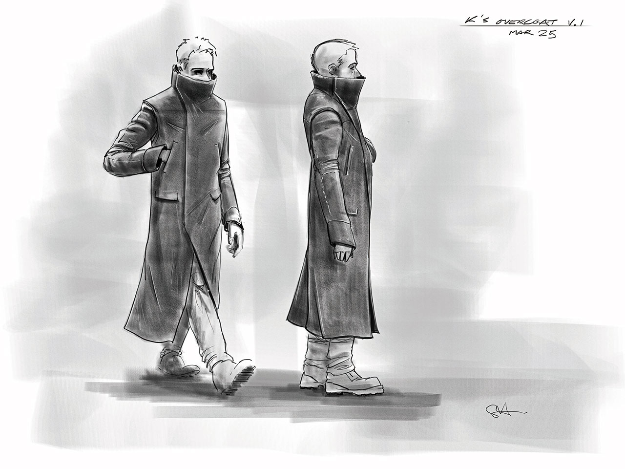 에이프릴은 “전편과 같은 세계지만 상황이 더 나빠졌어요. 더럽고 질척이죠. 살기 좋은 세계가 아니에요”라고 10월 개봉하는 <블레이드 러너 2049>의 배경인 전편보다 30년이나 흐른 세계에 대해 설명했다. 1982년에 데커드가 입은 트렌치코트에서 일부 영감을 얻은 고슬링의 코트는 신작에 맞게 업그레이드됐다. 내구성이 향상된 더스터 코트는 방수 코팅된 면을 겉감으로 사용하고 회색빛이 도는 녹색으로 염색했다. 또한 지퍼나 단추 대신 자석 여밈을 감춰 달았다. 덕분에 코트는 깔끔하고 미래적인 분위기를 풍긴다. 또한 코트의 칼라 깃을 세우면 얼굴을 가리는 임시 마스크 기능도 한다. 에이프릴은 이 디자인에 대해 영화 속 세계의 오염을 반영한 것이기도 하지만 한편으로는 ‘쿨’해서 추가했다고 말했다. 그리고 에이프릴은 마지막으로 고슬링의 의견도 보탰다. “그는 깃에도 모피를 둘러달라고 했어요. 처음에는 계획에 없었던 거죠.”