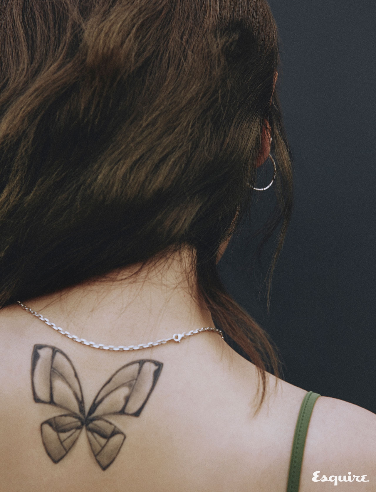 네. 그리고 여기도, 여기도, 여기도 있어요. 목뒤에는 나비가 있어요. 철로 된 나비. ‘아이언 걸’이라는 곡에서 ‘번데기 안의 나비’라는 가사에 철을 입힌 거예요. 여기는 총이 있어요. ‘본드’라는 곡에서 나온 소재죠. 007의 7을 총으로 했어요. 여기는, 혹시 해리포터 좋아하세요? 거기 나오는 그리핀도르의 검이에요. 용기 있는 자만이 그 칼을 뽑을 수 있거든요.